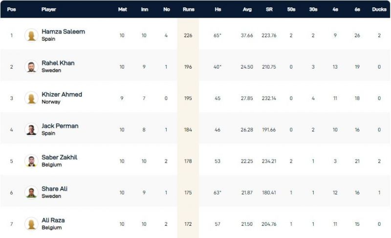 Austria's Razmal Shigiwal (104) and Iqbal Hossain (103), Portugal's Amir Zaib (72) and Najjam Shahzad (46), Hungary's Zahir Safi Mohammed (58) and Zeeshan Kukikhel (43), Netherlands XI's Boris Gorlee (56) and Victor Lubbers (45), and Romania's Sivakumar Periyalwar (46) are the highest run-scorers from their respective sides.