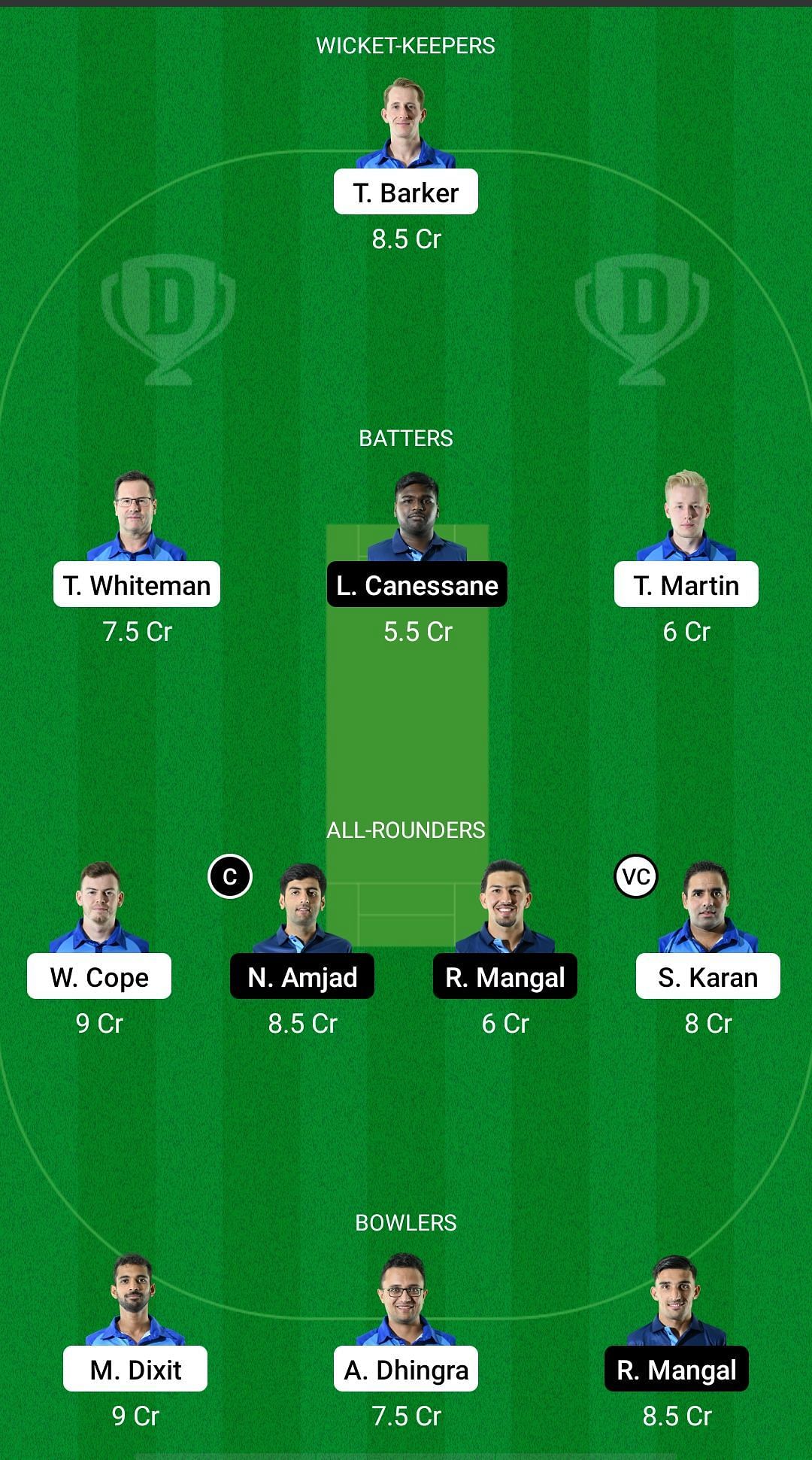 Vikram Vijh (C), Timothy Barker, Anoop Orsu (WK), William Cope, Shiv Karan Gill, Thomas Martin, Oscar Whiteman, Mohit Dixit, Eliyas Jabarkhel, Amit Dhingra, and Marcus Cope.