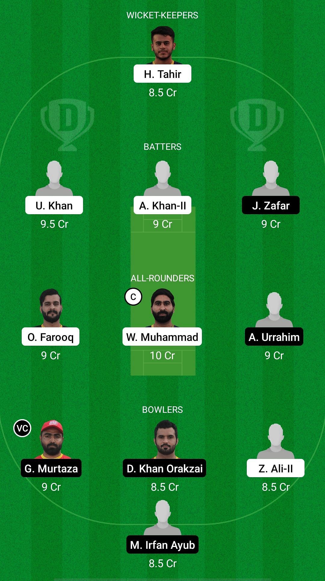 Fantasy Suggestion #2: Hamdan Tahir, Usman Khan, Ali Khan, Jamshaid Zafar, Omer Farooq, Waseem Muhammad, Attah Urrahim, Ghulam Murtaza, Dilawar Khan Orakzai, Zahid Ali, Mohammad Irfan Ayub.
