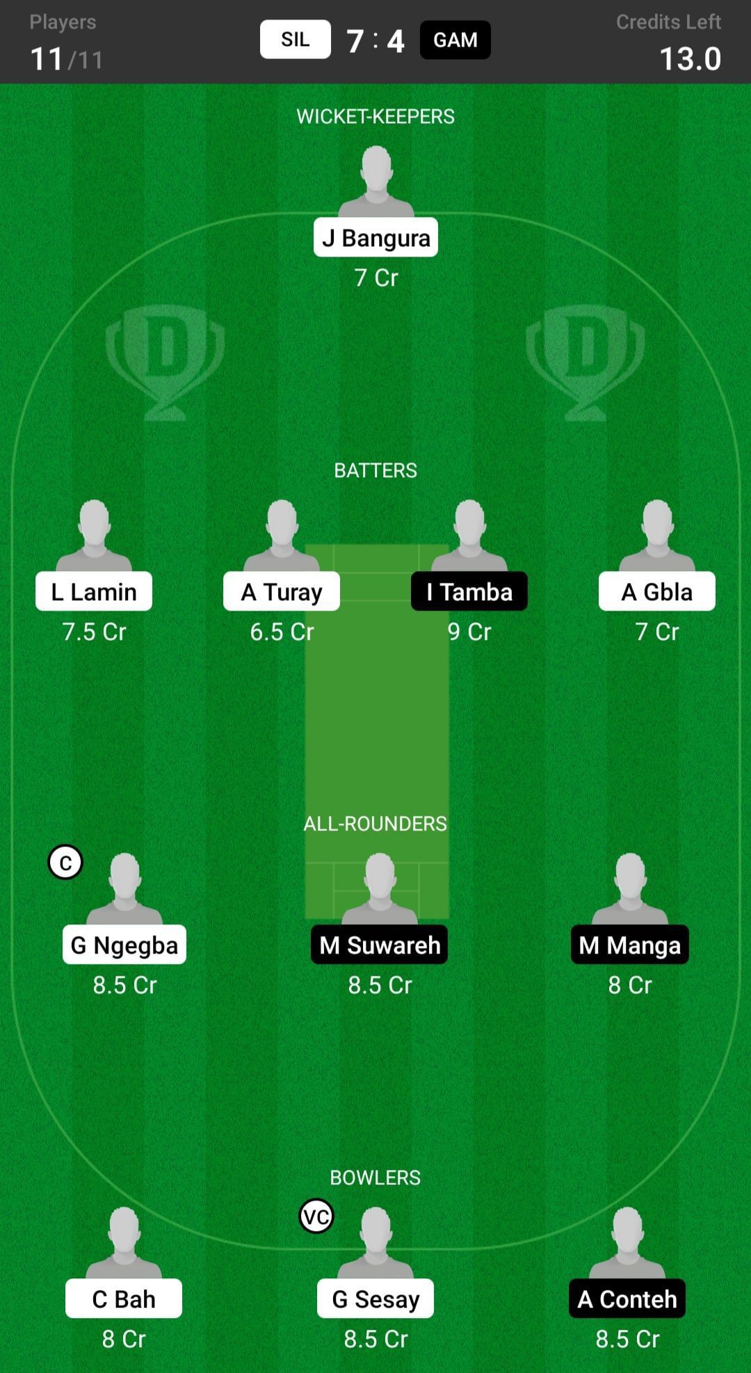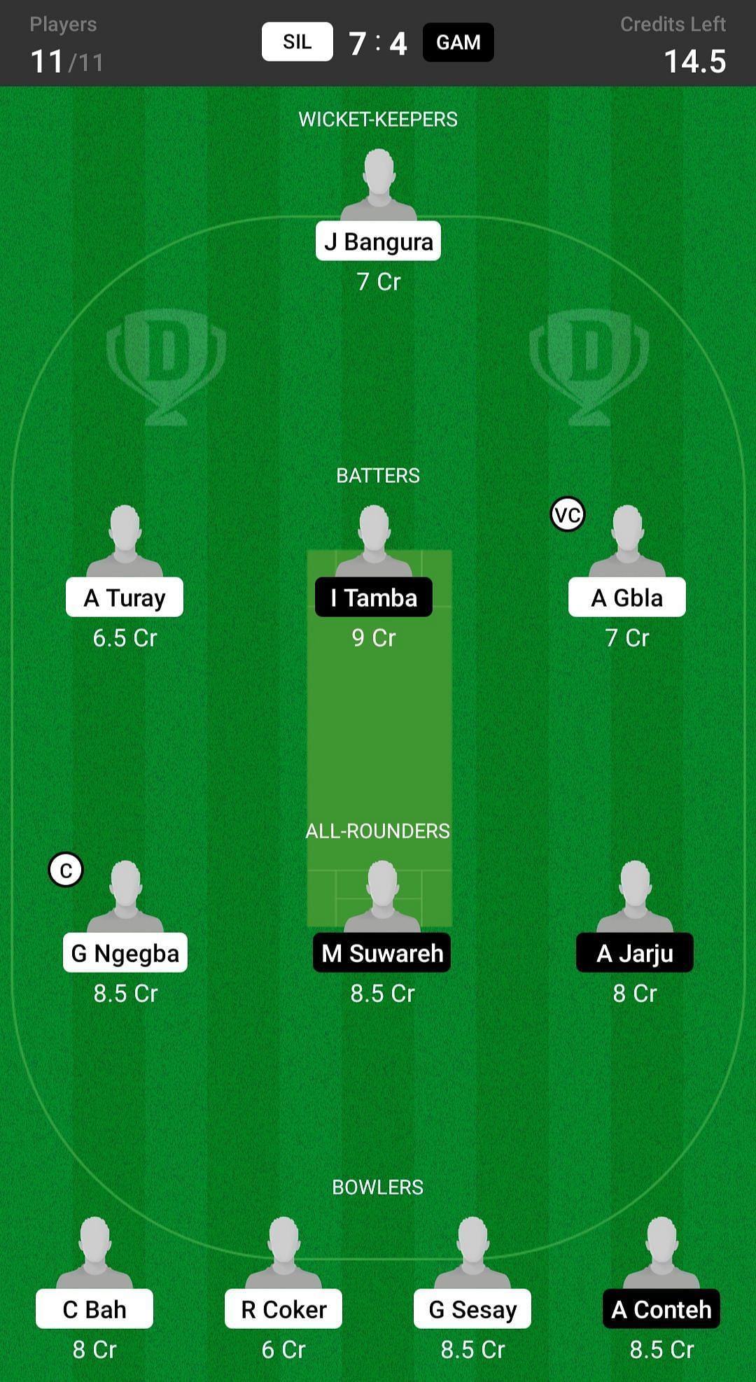 A Gbla and A Turay are the two best batsmen picks for the Dream11 team. L Lamin has played exceptionally well in the last few matches, so he is also a good pick for today's Dream11 team.