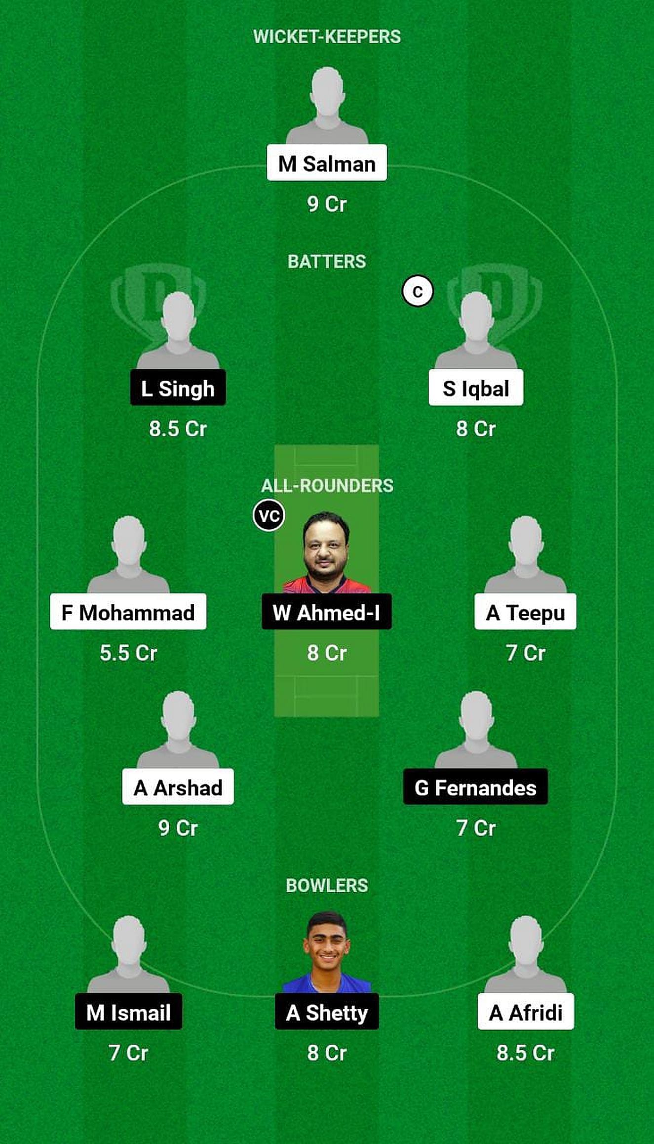 Shahrukh Amin (c), Glenn Fernandes, Muhammed Ismail, Lovepreet Singh, Faisal Altaf, Ahaan Fernandes, Adithya Shetty, Safeer Tariq (wk), Mubeen Ali, Waqas Ahmed, Sardar Bahzad