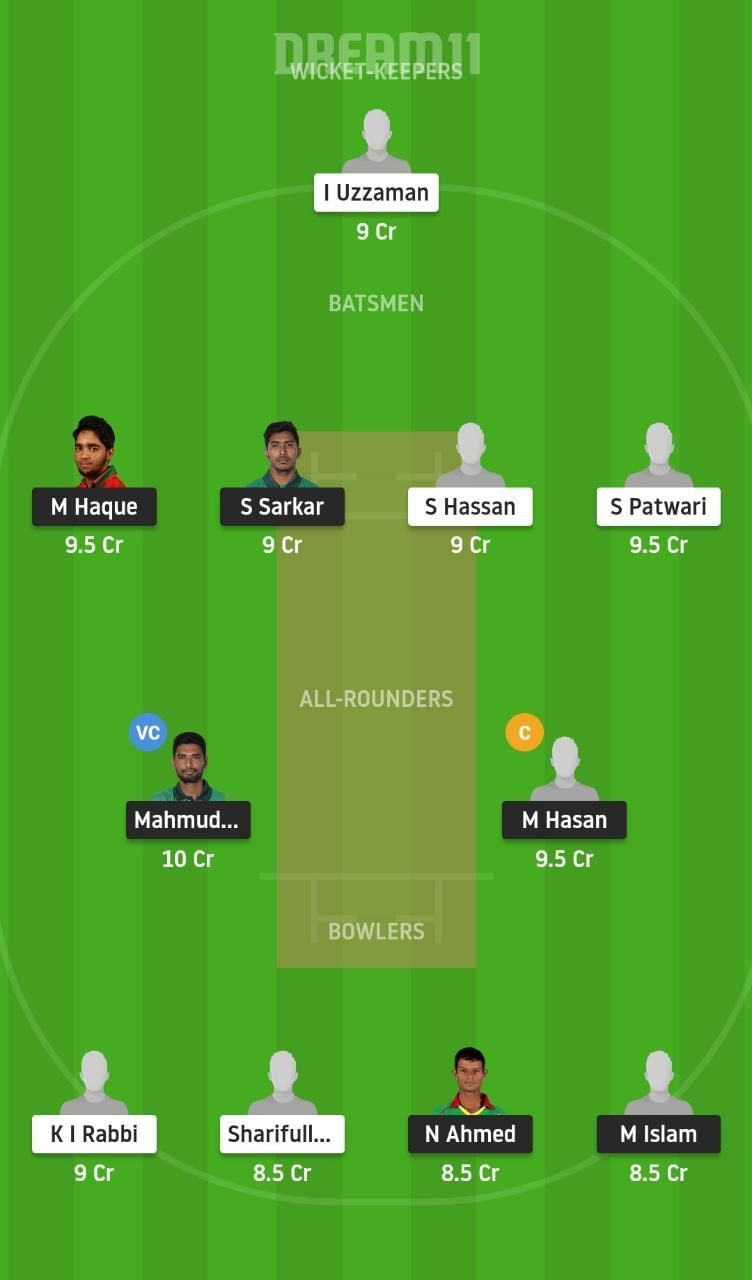 Fantasy Suggestion #1: I Uzzaman, S Sarkar, M Haque, S Patwari, S Hassan, Mahmudullah, M Hasan, N Ahmed, M Islam, Sharifullah, K I Rabbi