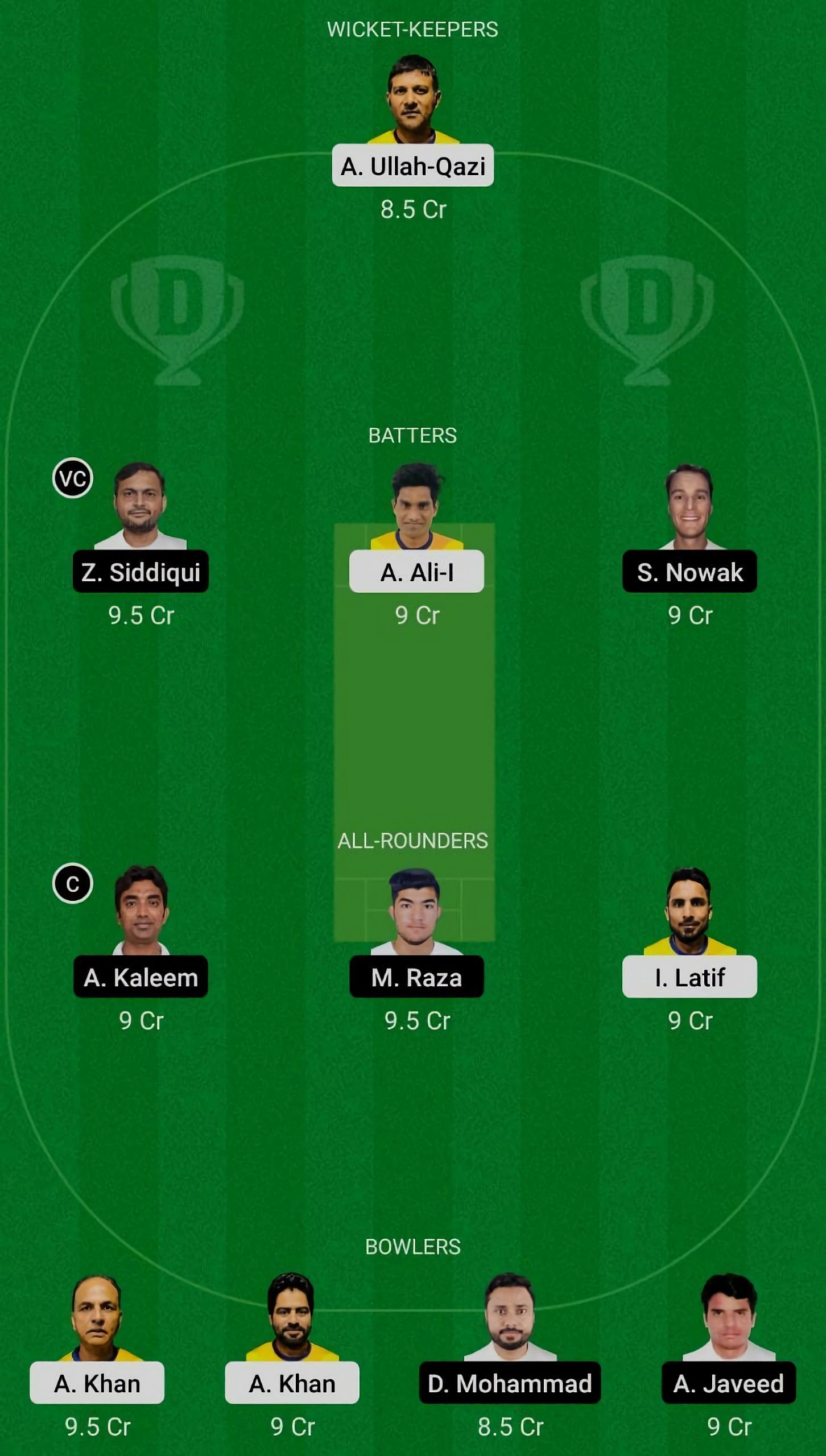 Fantasy Suggestion #1: A Ullah-Qazi, Z Siddiqui, S Nowak, A Ali, M Raza, I Latif, A Kaleem, G Iqbal, D Mohammad, A Khan, A Javeed