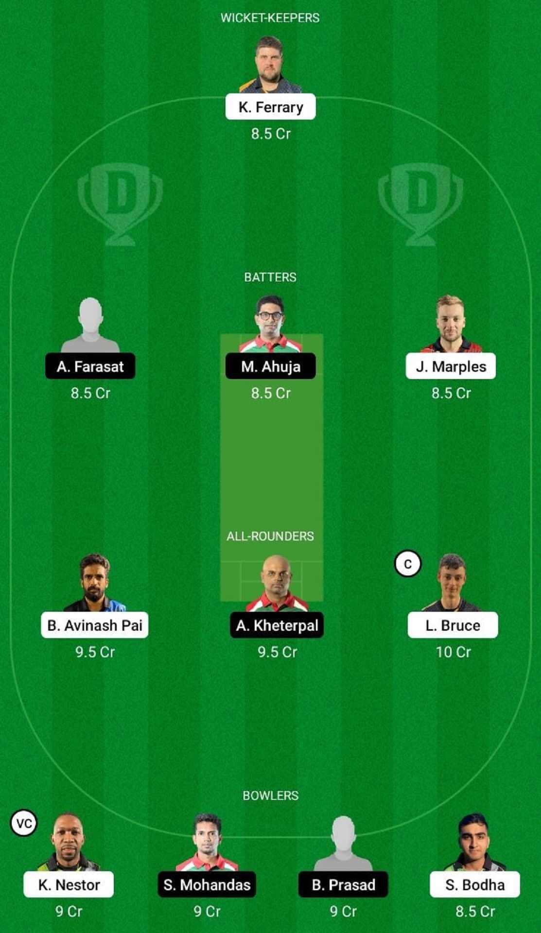 Fantasy Suggestion #2: K Ferrary, J Marples, M Ahuja, A Farasat, B Avinash Pai, L Bruce, A Kheterpal, S Bodha, K Nestor, B Prasad, S Mohandas.