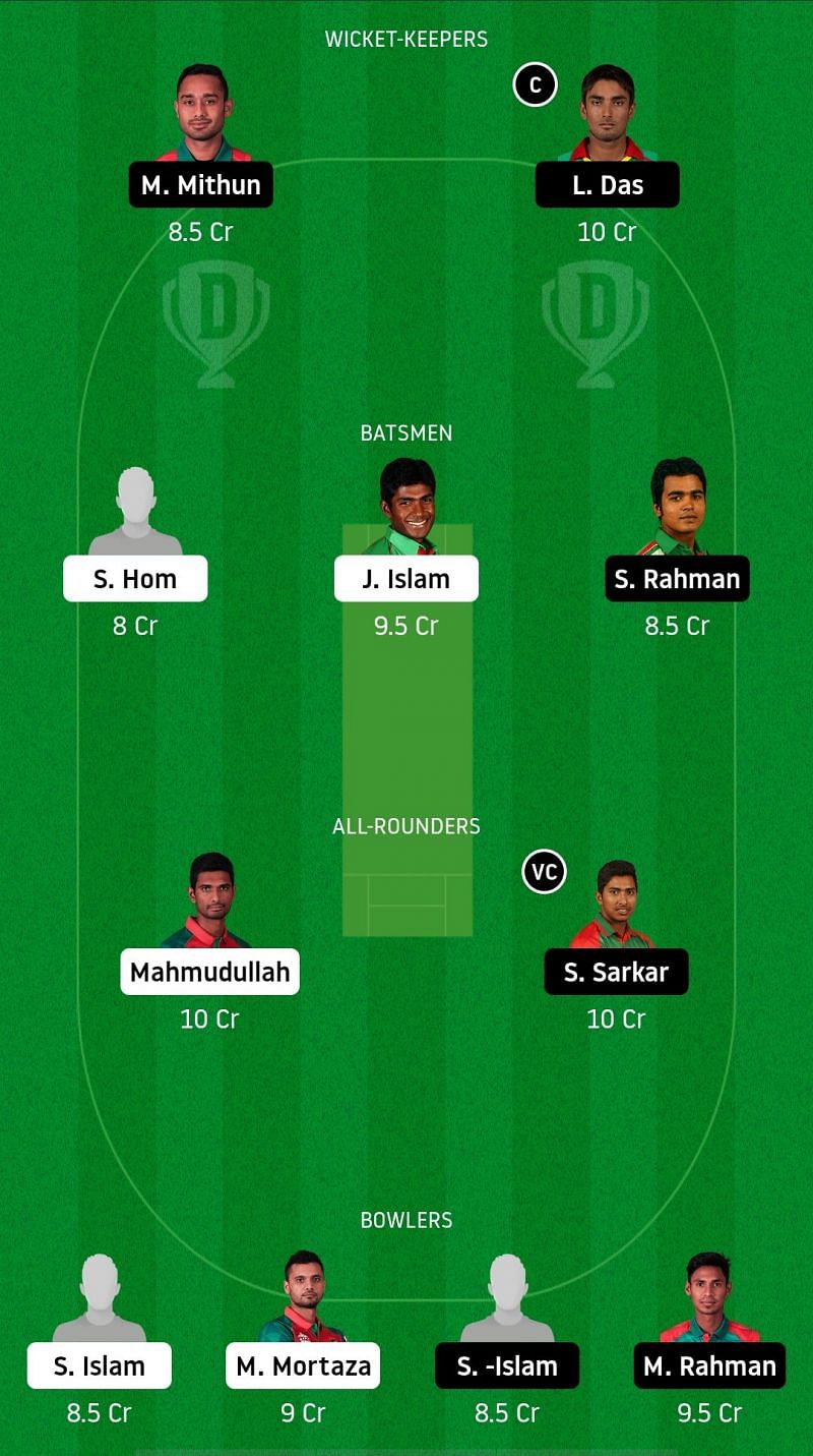 Fantasy Suggestion #1: Liton Das, Mohammad Mithun, Shuvagata Hom, Shamsur Rahman, Jahurul Islam, Soumya Sarkar, Mahmudullah, Mashrafe Mortaza, Shahidul Islam, Mustafizur Rahman, Shoriful Islam.