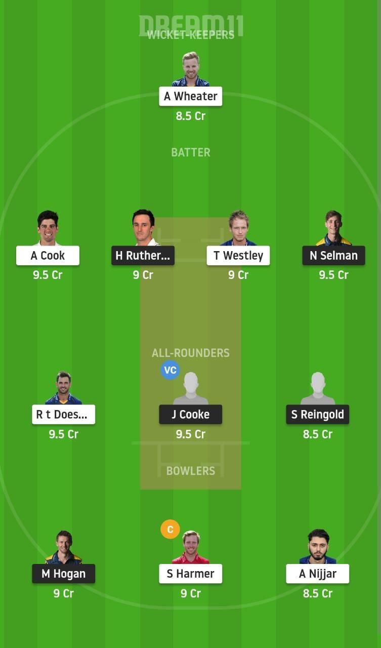 Fantasy Suggestion #1: Adam Wheater, Tom Westley, Alastair Cook, Nick Selman, Josh Rymell, Ryan ten Doeschate, Joe Cooke, Steven Reingold, Simon Harmer, Aron Nijjar, Michael Hogan