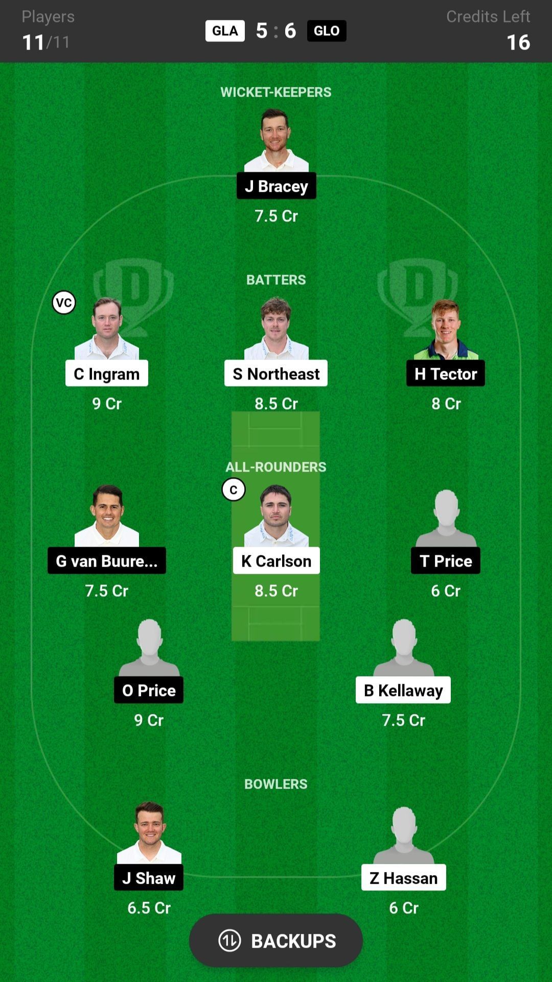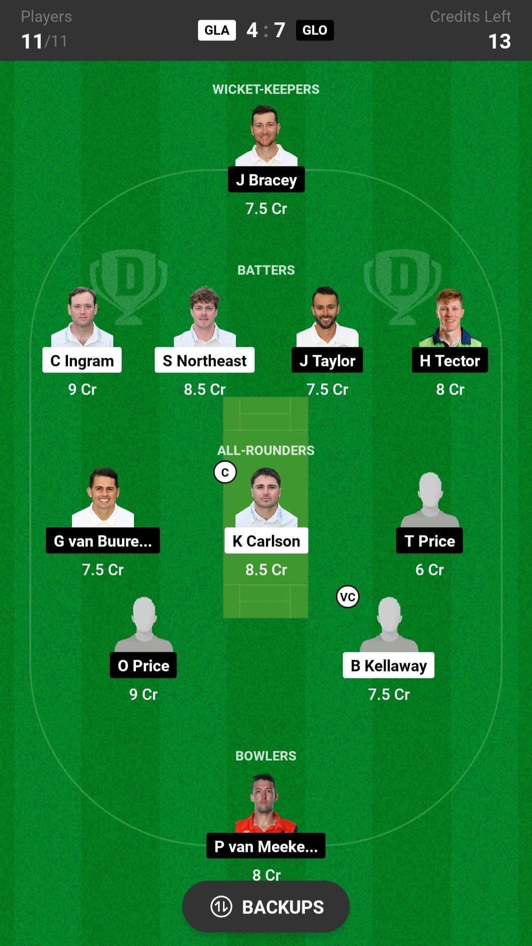 K Carlson and B Kellaway are the best all-rounder picks for the Dream11 team as they are batting in the top order and also completing their quota of overs. O Price is another good pick for today's Dream11 match.
