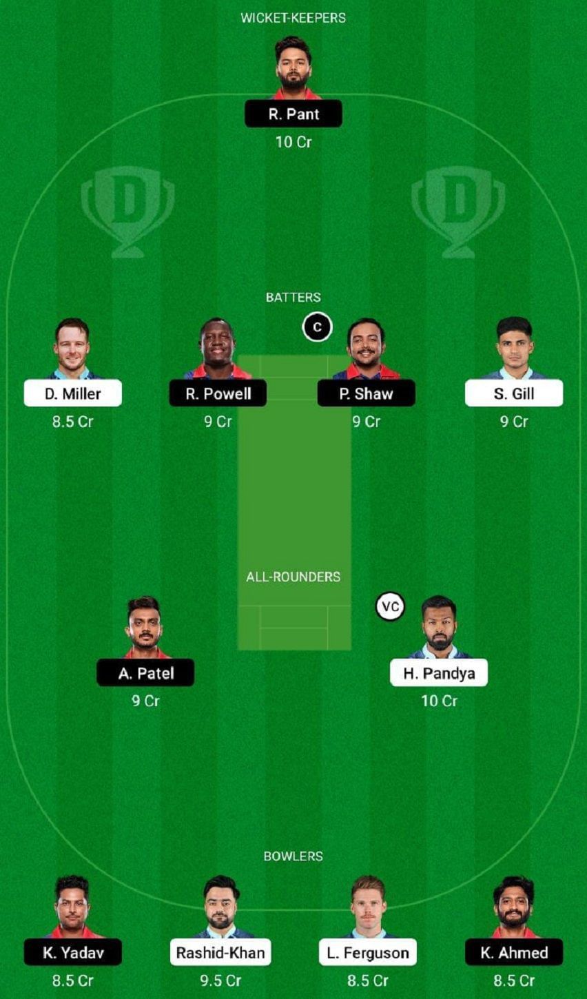 Fantasy Suggestion #2: Rishabh Pant, Prithvi Shaw, Shubman Gill, David Miller, Axar Patel, Hardik Pandya, Rovman Powell, Kuldeep Yadav, Khaleel Ahmed, Rashid Khan and Lockie Ferguson.