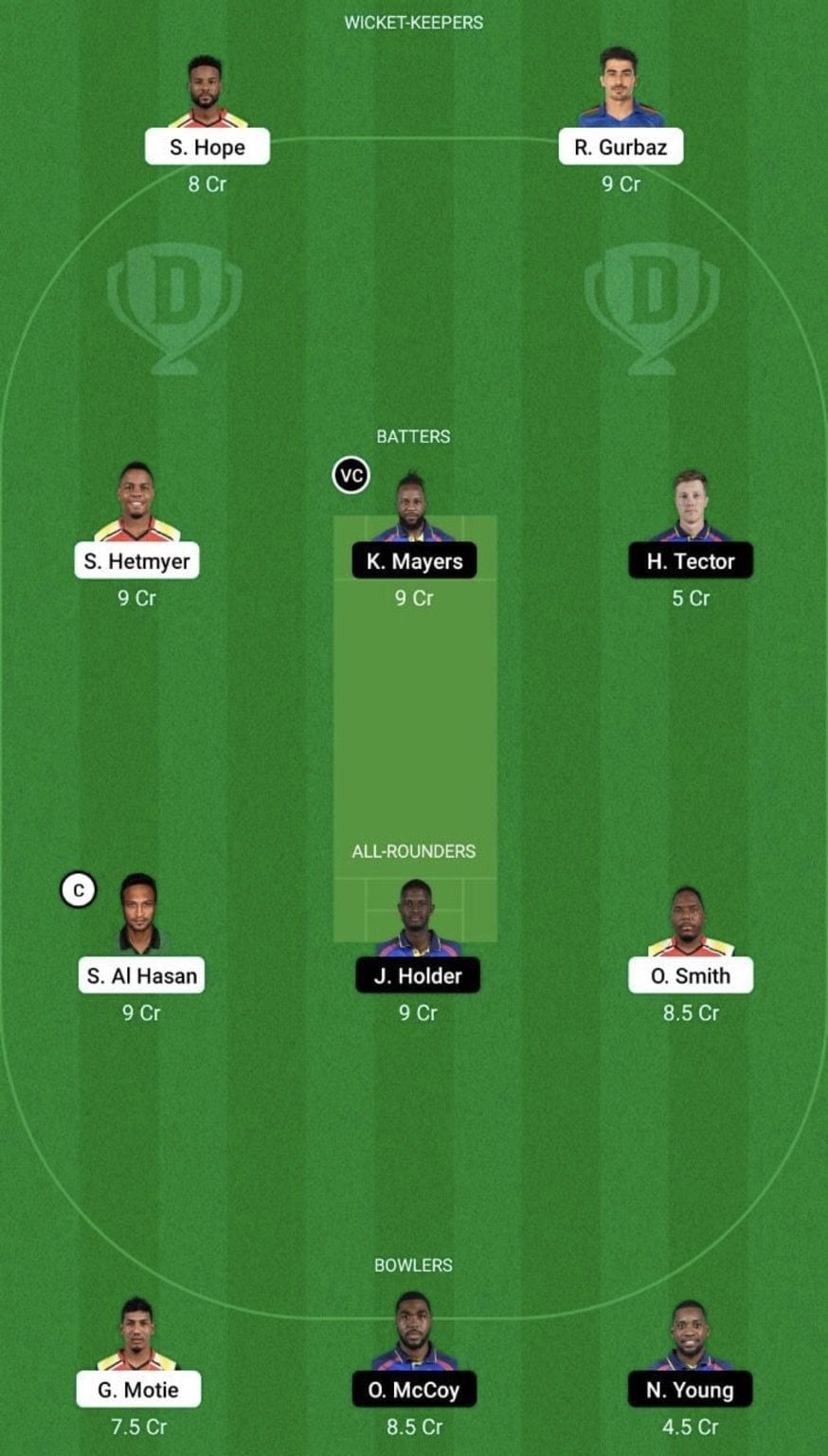 Rahmanullah Gurbaz (wk), Chandrapaul Hemraj, Shai Hope, Shimron Hetmyer (c), Shakib Al Hasan, Keemo Paul, Odean Smith, Romario Shepherd, Imran Tahir, Junior Sinclair and Gudakesh Motie.