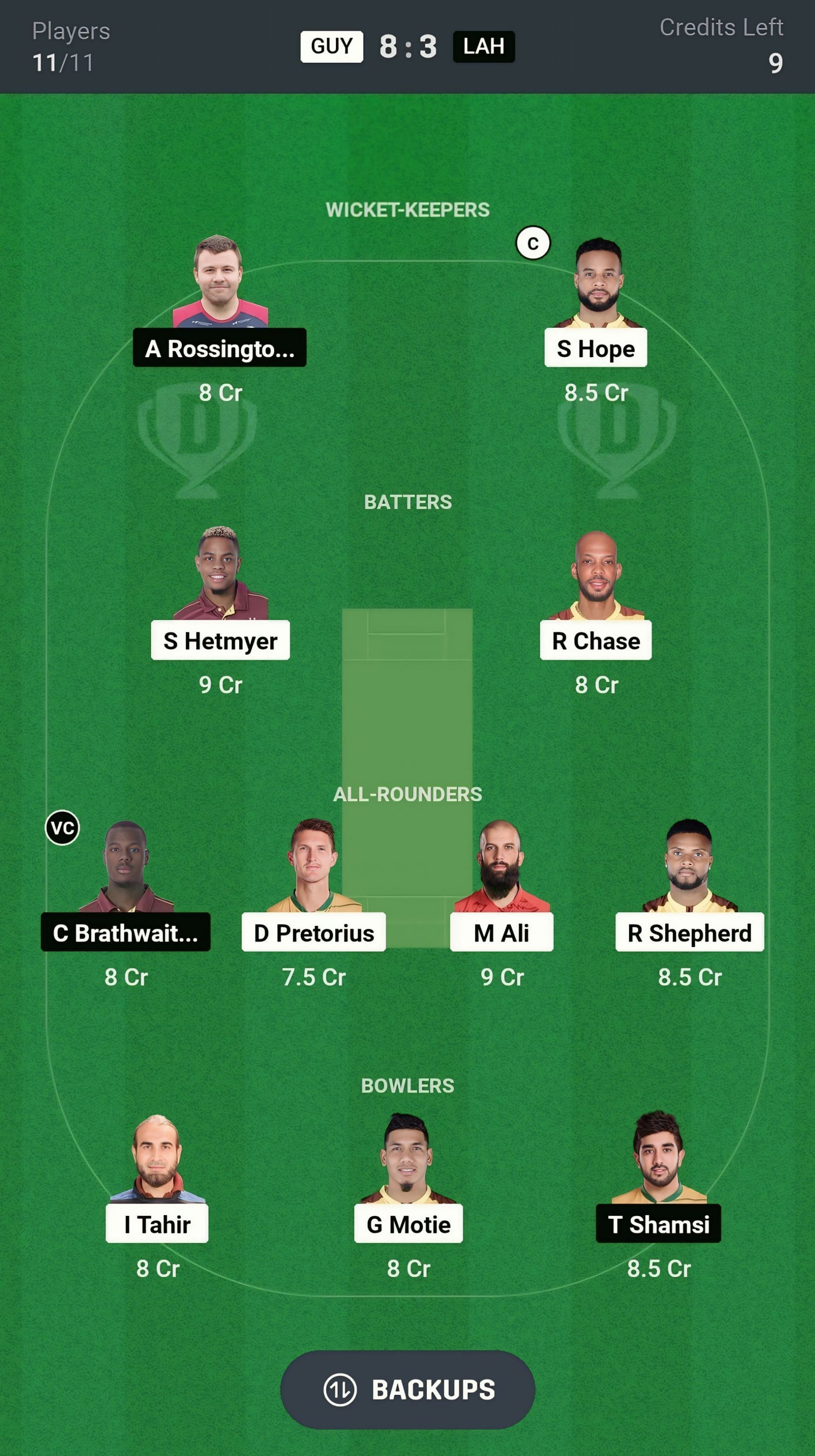 Shai Hope (wk), Mark Deyal, Moeen Ali, Shimron Hetmyer, Roston Chase, Dwaine Pretorius, Romario Shepherd, Hassan Khan, Keemo Paul, Gudakesh Motie, Imran Tahir (c)