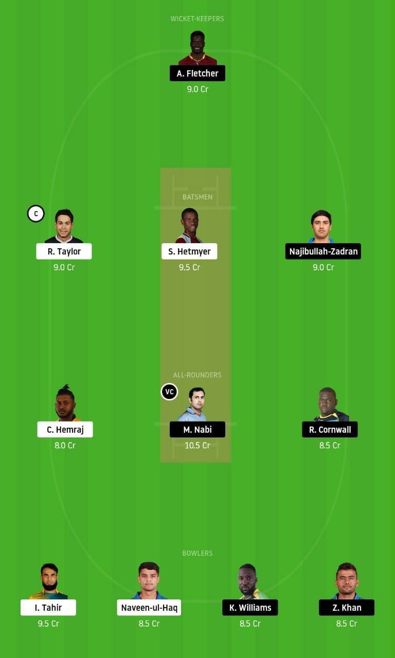 Fantasy Suggestion #1: Andre Fletcher, Shimron Hetmyer, Najibullah Zadran, Ross Taylor, Mohammad Nabi, Rakheem Cornwall, Chanderpaul Hemraj, Imran Tahir, Naveen-ul-Haq, Kesrick Williams and Zahir Khan