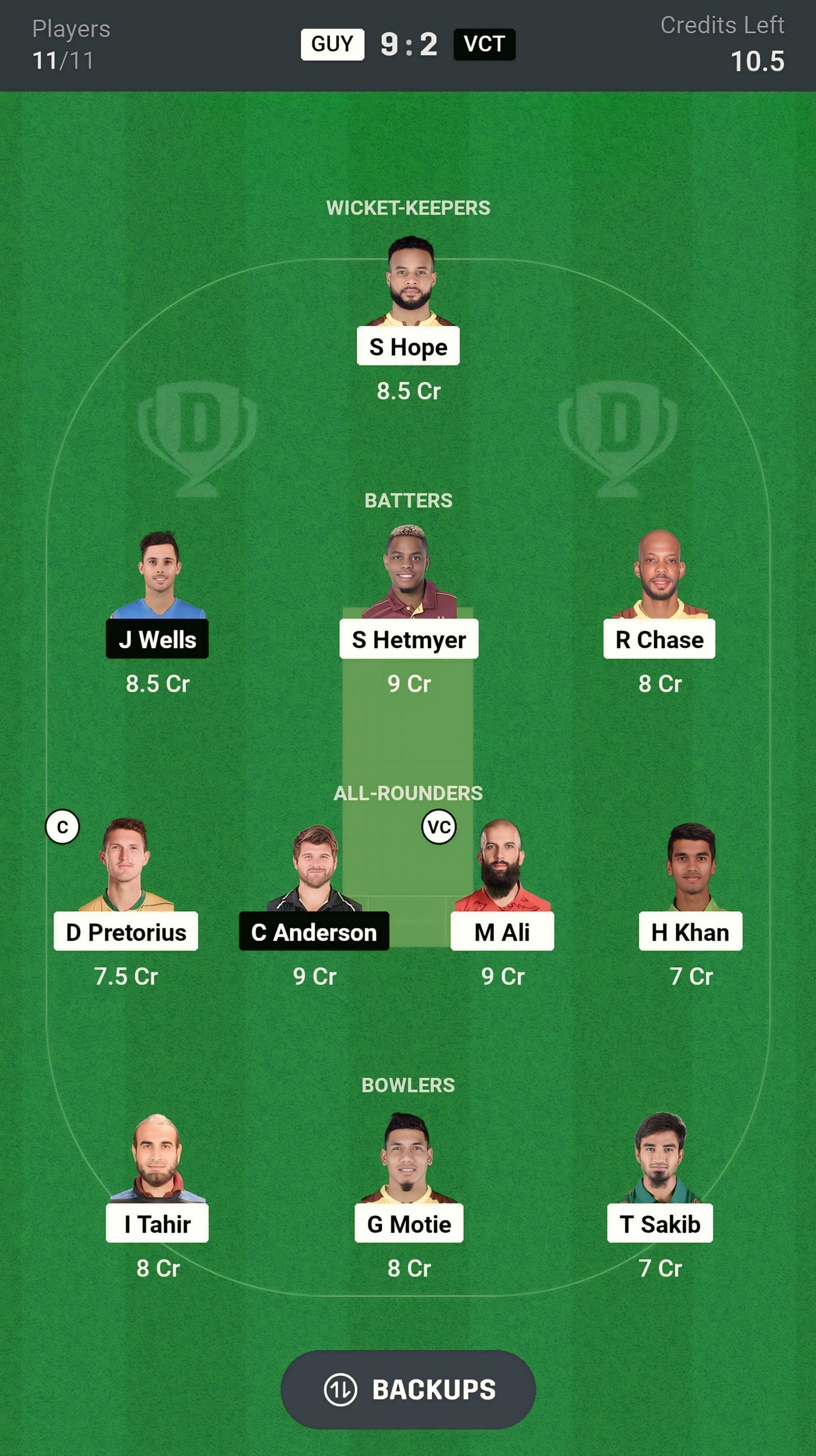 Shai Hope (wk), Mark Deyal, Moeen Ali, Shimron Hetmyer, Roston Chase, Dwaine Pretorius, Romario Shepherd, Hassan Khan, Keemo Paul, Gudakesh Motie, Imran Tahir (c)