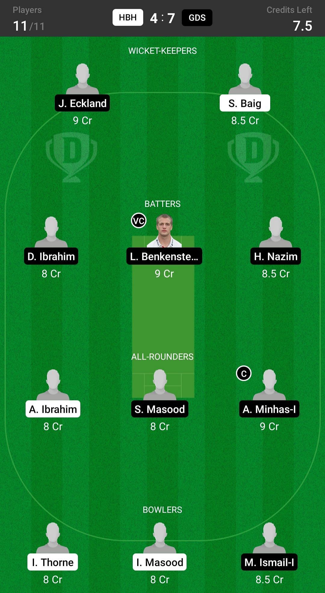 D Ibrahim and L Benkenstein are the two best batter picks. H Nazim is another good pick. He has performed exceptionally well in the last few games.