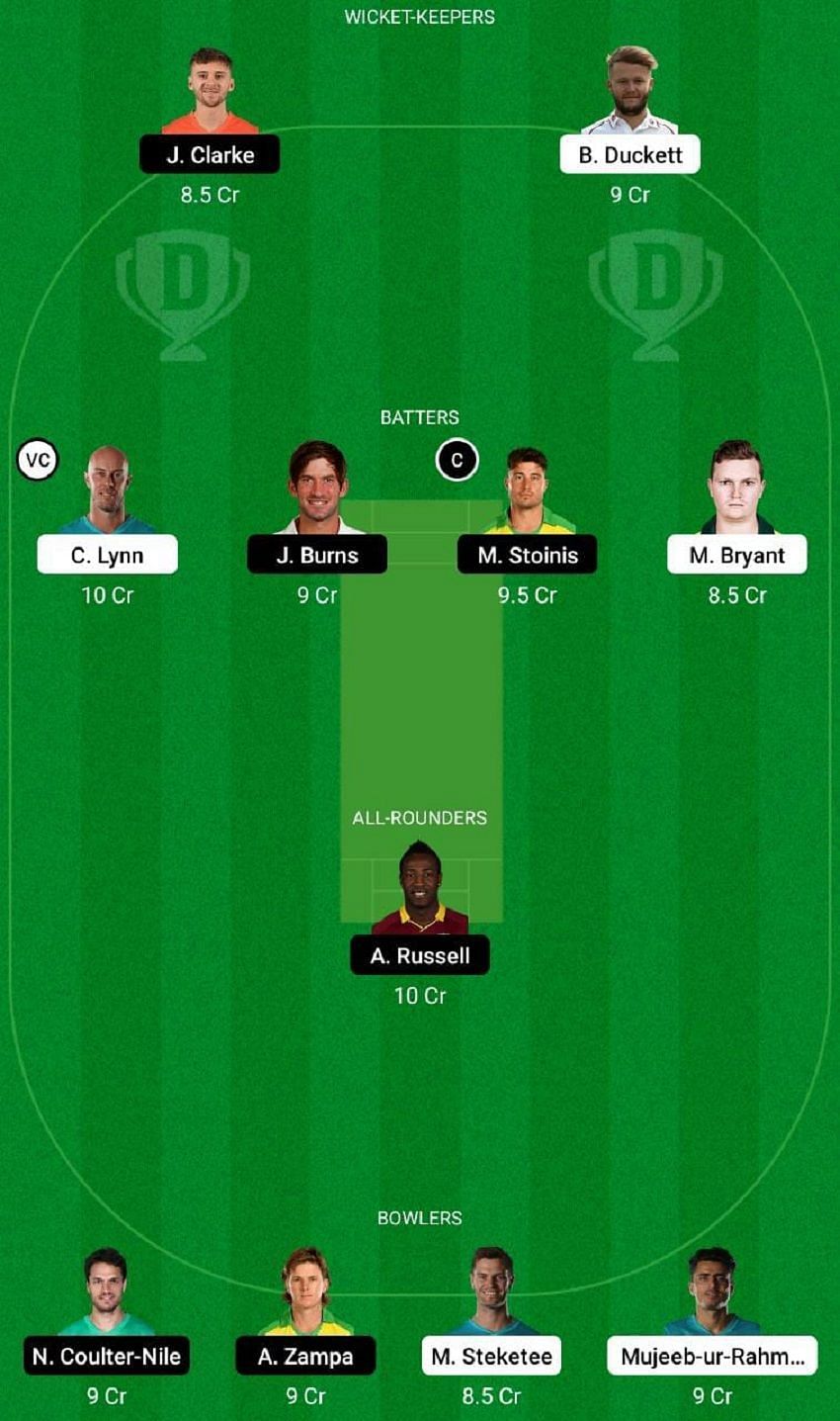 Fantasy Suggestion #1: Joe Clarke, Ben Duckett, Chris Lynn, Joe Burns, Marcus Stoinis, Max Bryant, Andre Russell, Nathan Coulter-Nile, Adam Zampa, Mark Steketee and Mujeeb ur Rehman