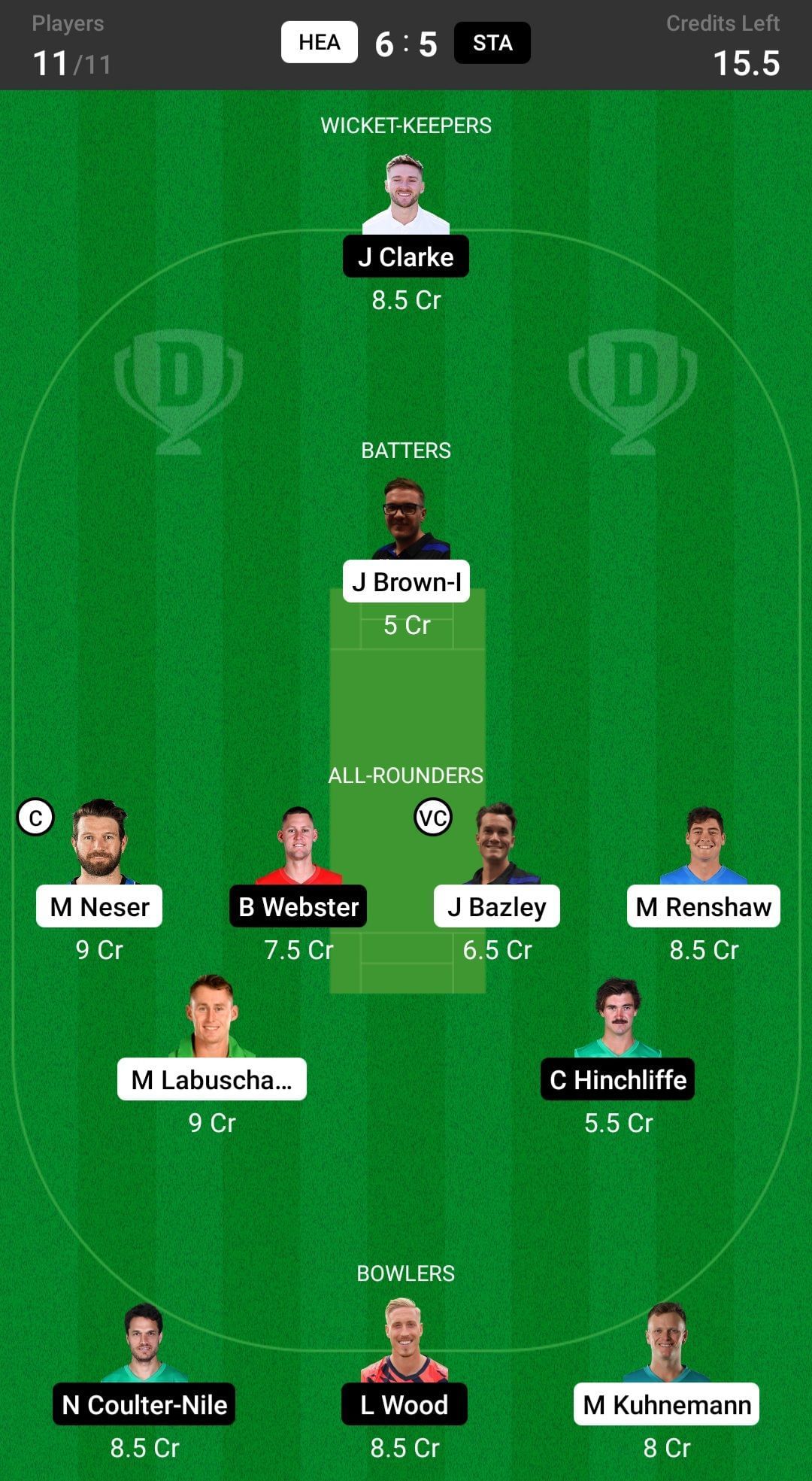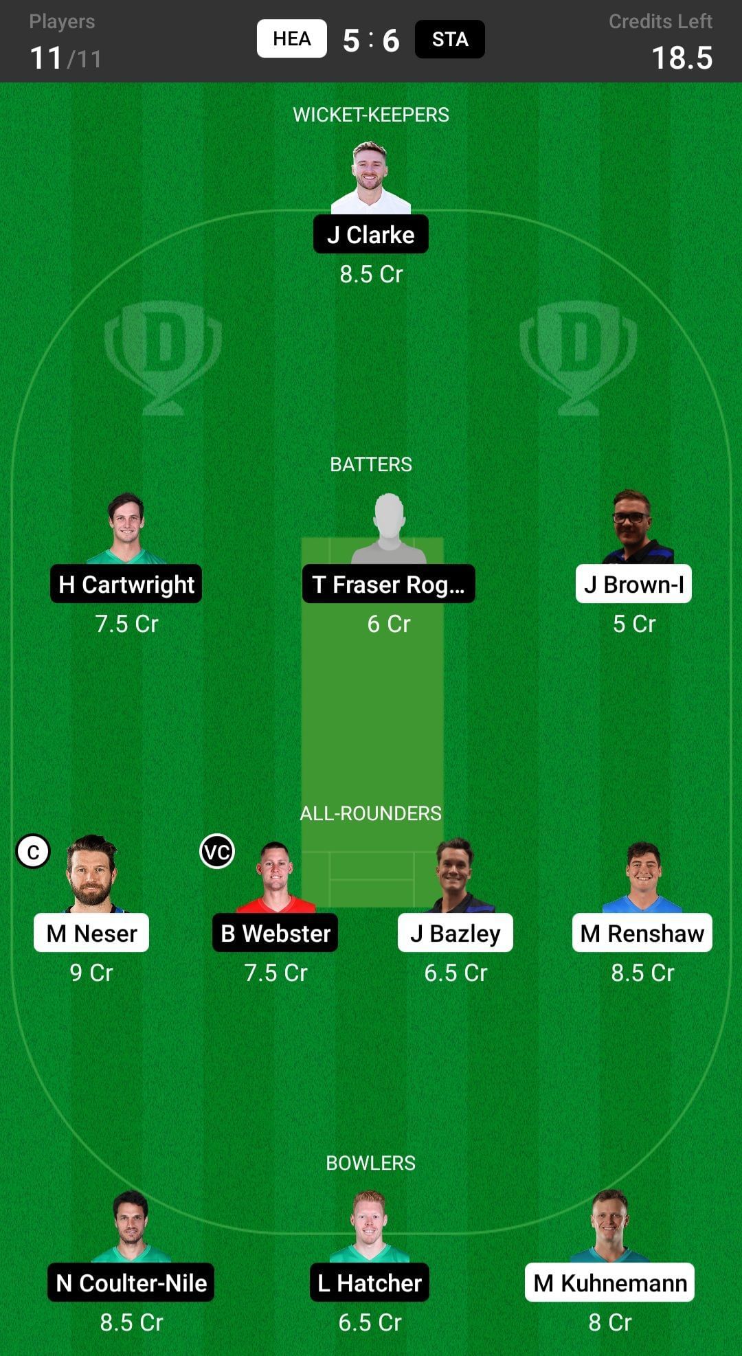 J Bazley and M Neser are the best all-rounder picks for the Dream11 team as they are batting in the top order and also completing their quota of overs. B Webster is another good pick for today's Dream11 team.