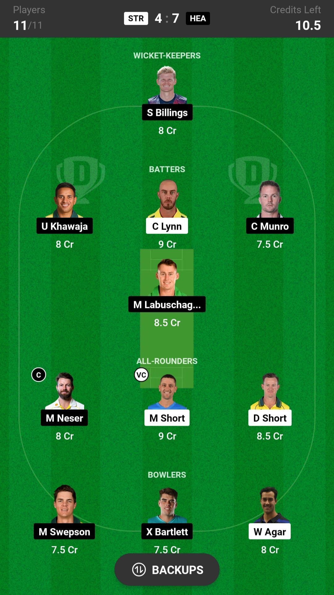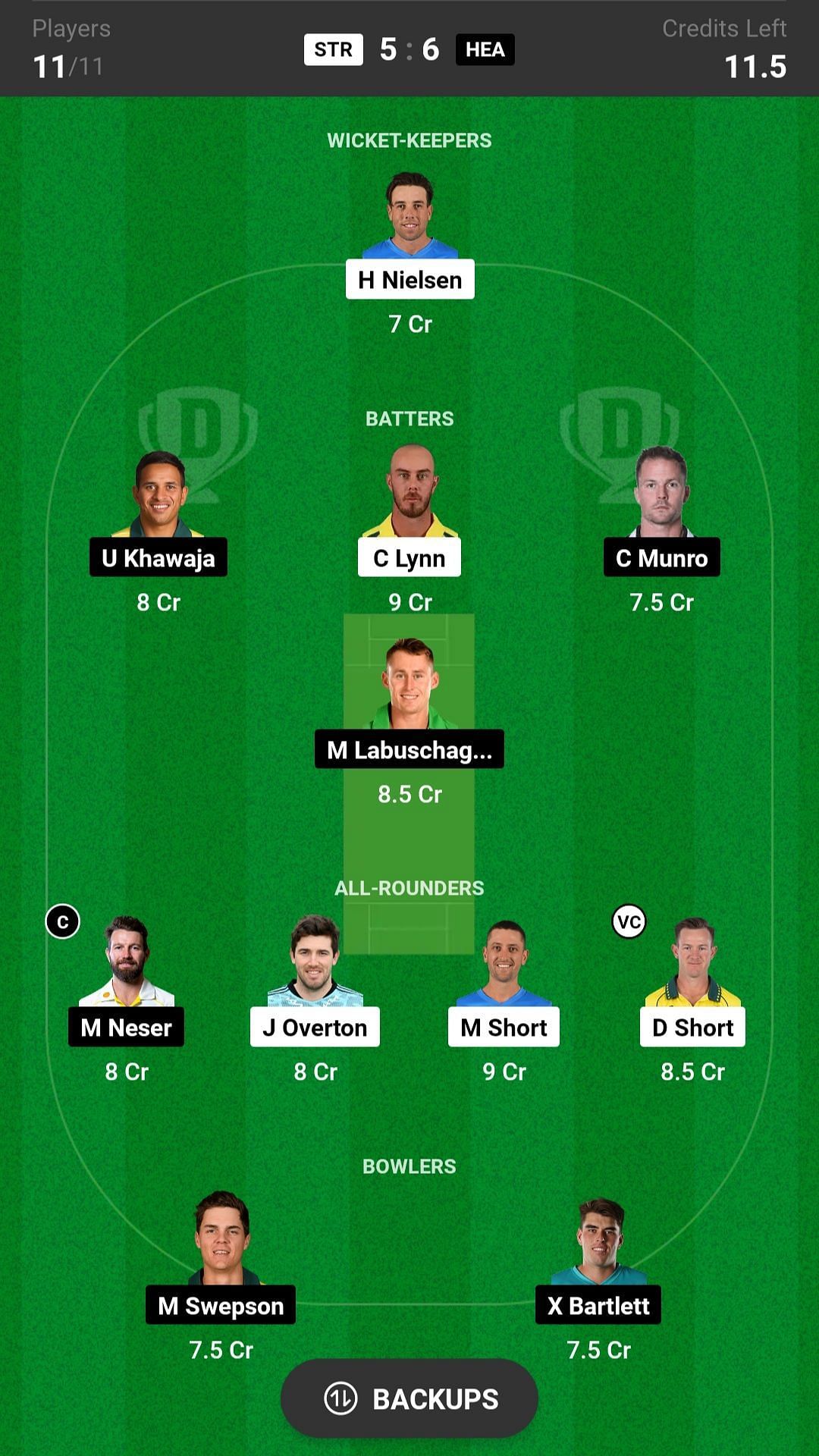 C Munro and M Labuschagne are the two best batter picks for the Dream11 team. Both the top-order batters are expected to perform well. U Khawaja is also a good pick.