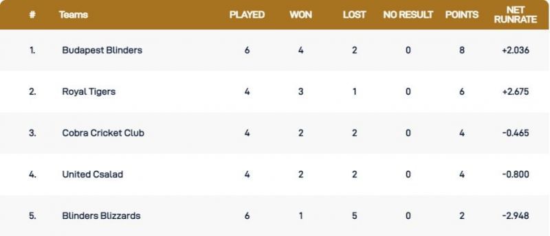 The Budapest Blinders occupy the top spot in the Hungary T10 League 2021 points table, with eight points to their credit. They are followed by the Royal Tigers, who have garnered six points in the four matches they have played.