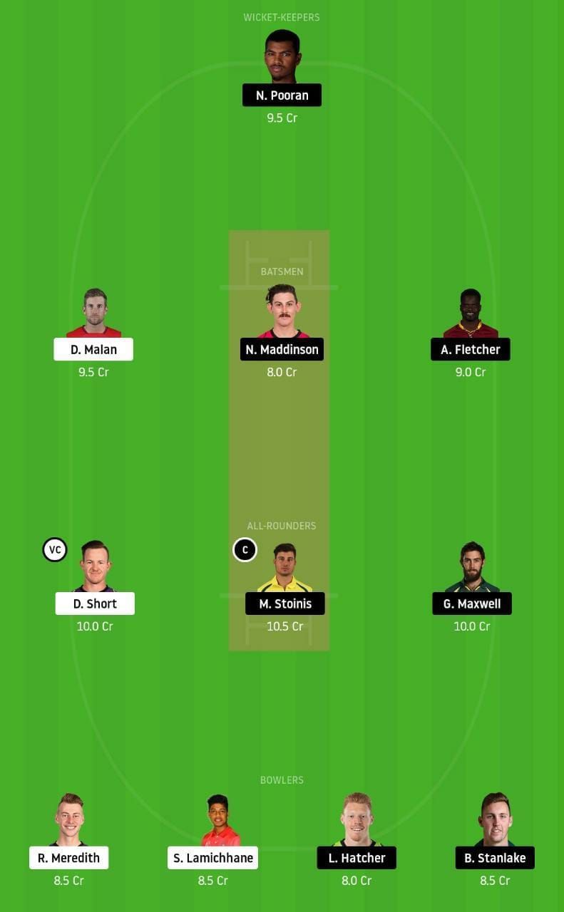 Fantasy Suggestion #1: Nicholas Pooran, Dawid Malan, Nic Maddinson, Andre Fletcher, D'Arcy Short, Marcus Stoinis, Glenn Maxwell, Liam Hatcher, Billy Stanlake, Riley Meredith and Sandeep Lamichhane