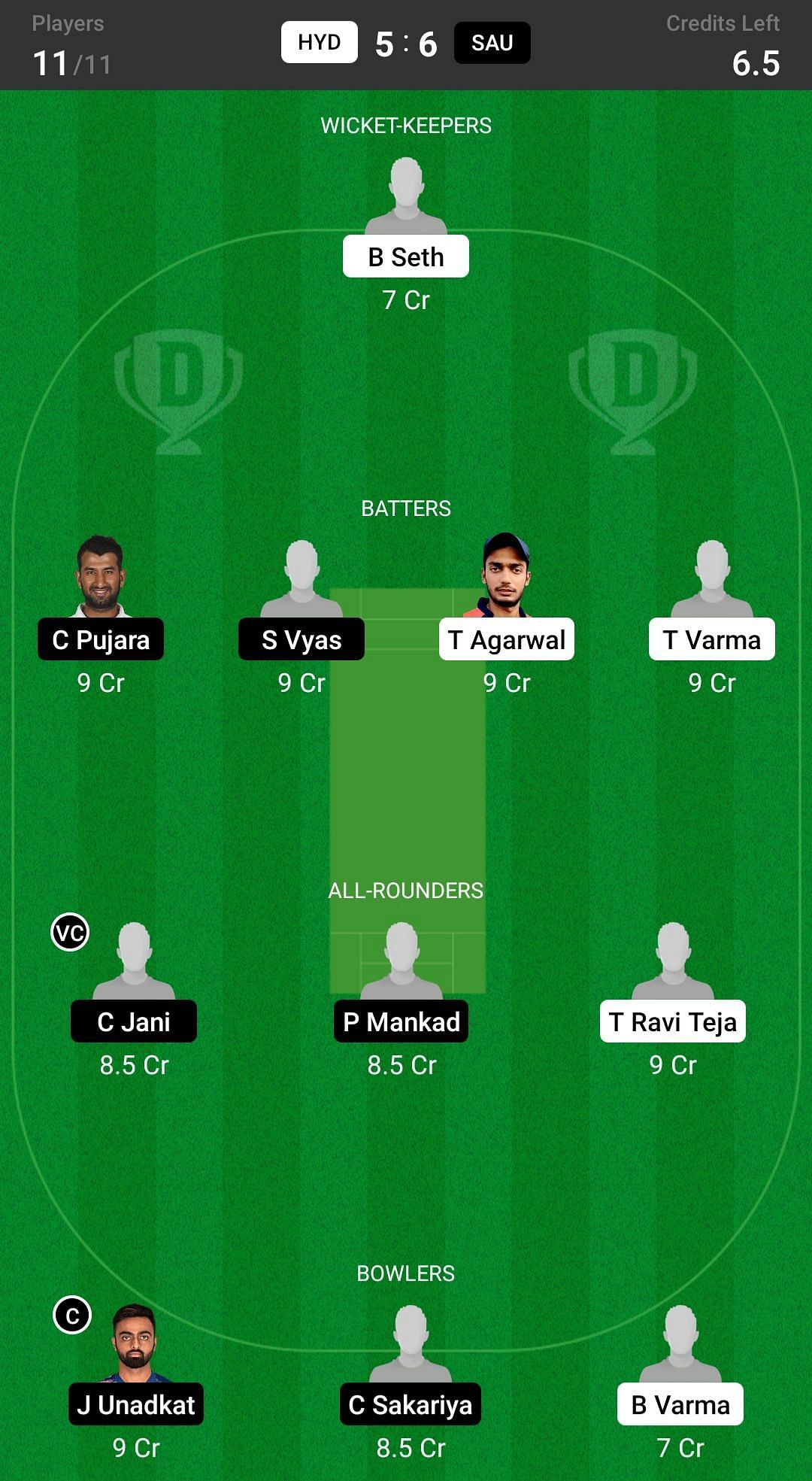 Batters: C Pujara, S Vyas, T Varma, T Agarwal