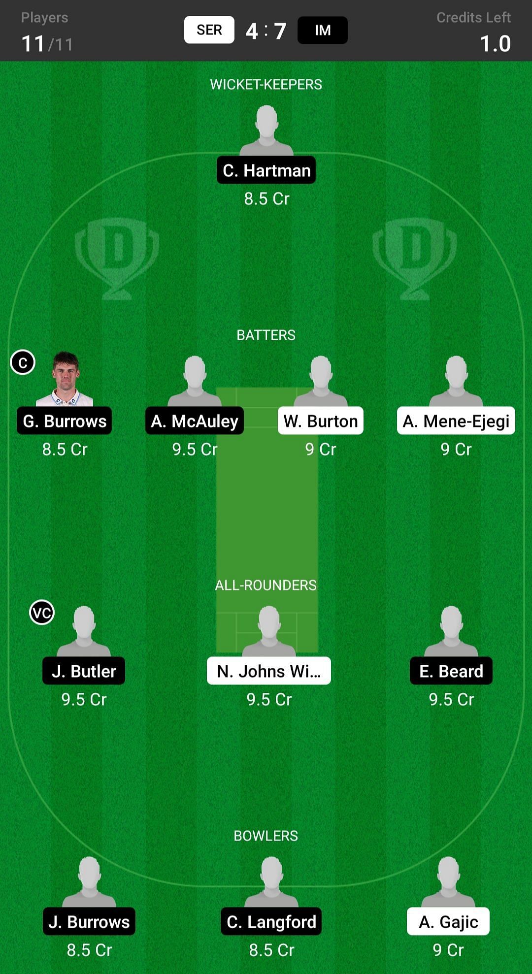 N Johns and J Butler are the best all-rounders to pick for the Dream11 team as they are batting in the top order and also completing their quota of overs. E Beard is another good pick for the Dream11 team.