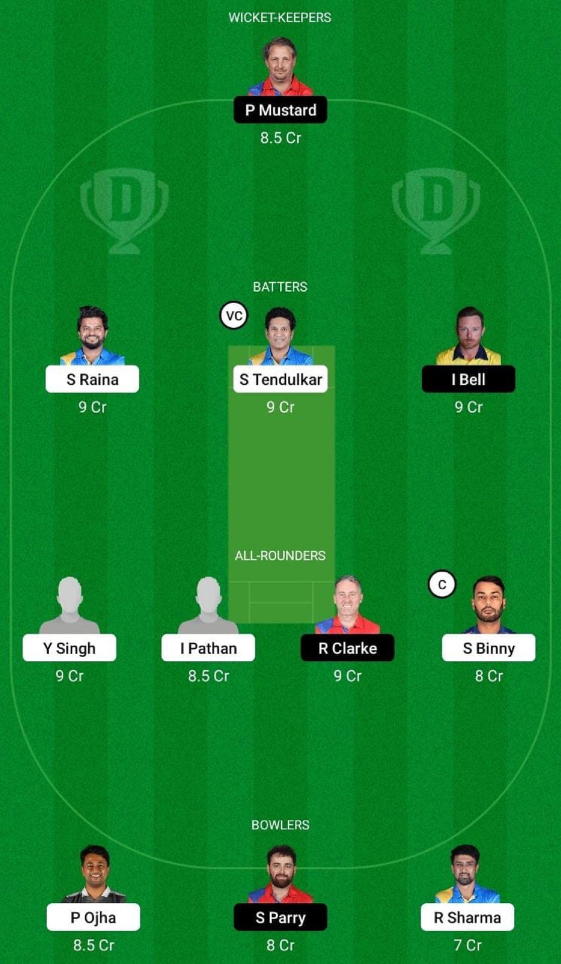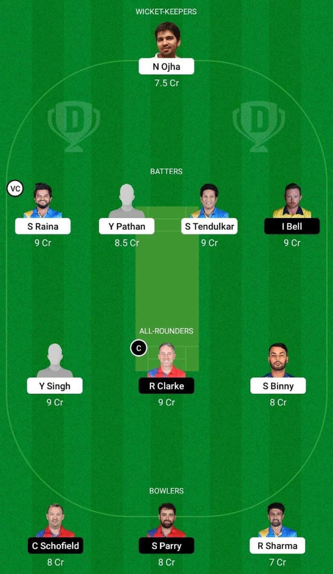 Batters: Ian Bell, Suresh Raina (vc), Yusuf Pathan, Sachin Tendulkar
