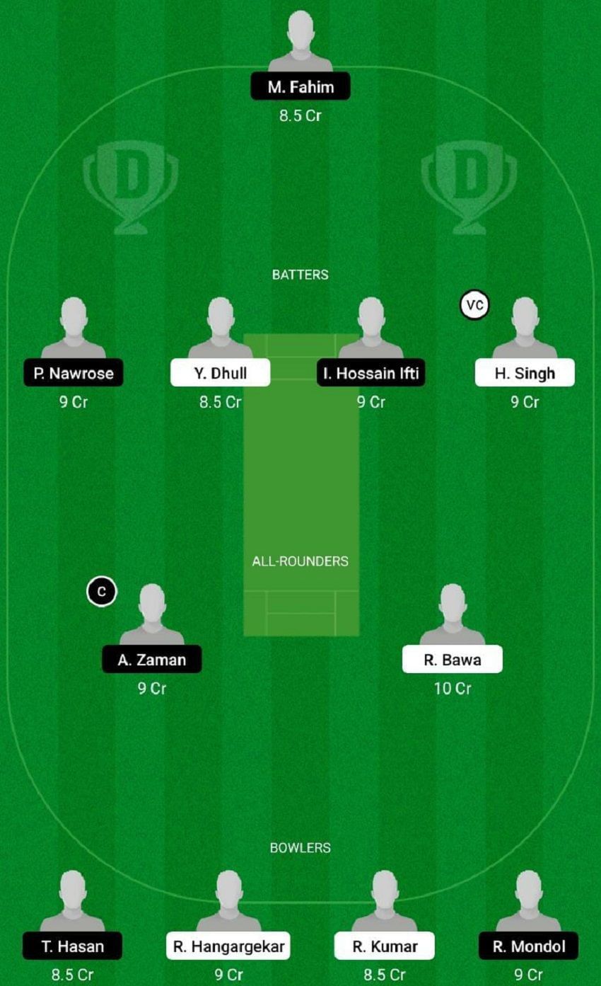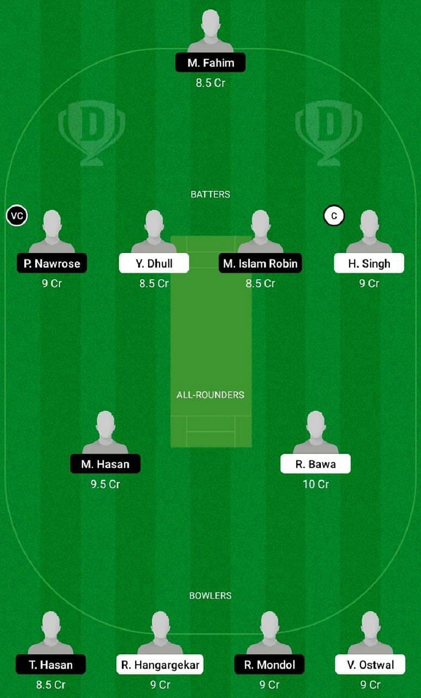 Fantasy Suggestion #1: M Fahim, P Nawrose, Y Dhull, M Islam Robin, H Singh, M Hasan, R Bawa, T Hasan, R Hangargekar, R Mondol and V Ostwal