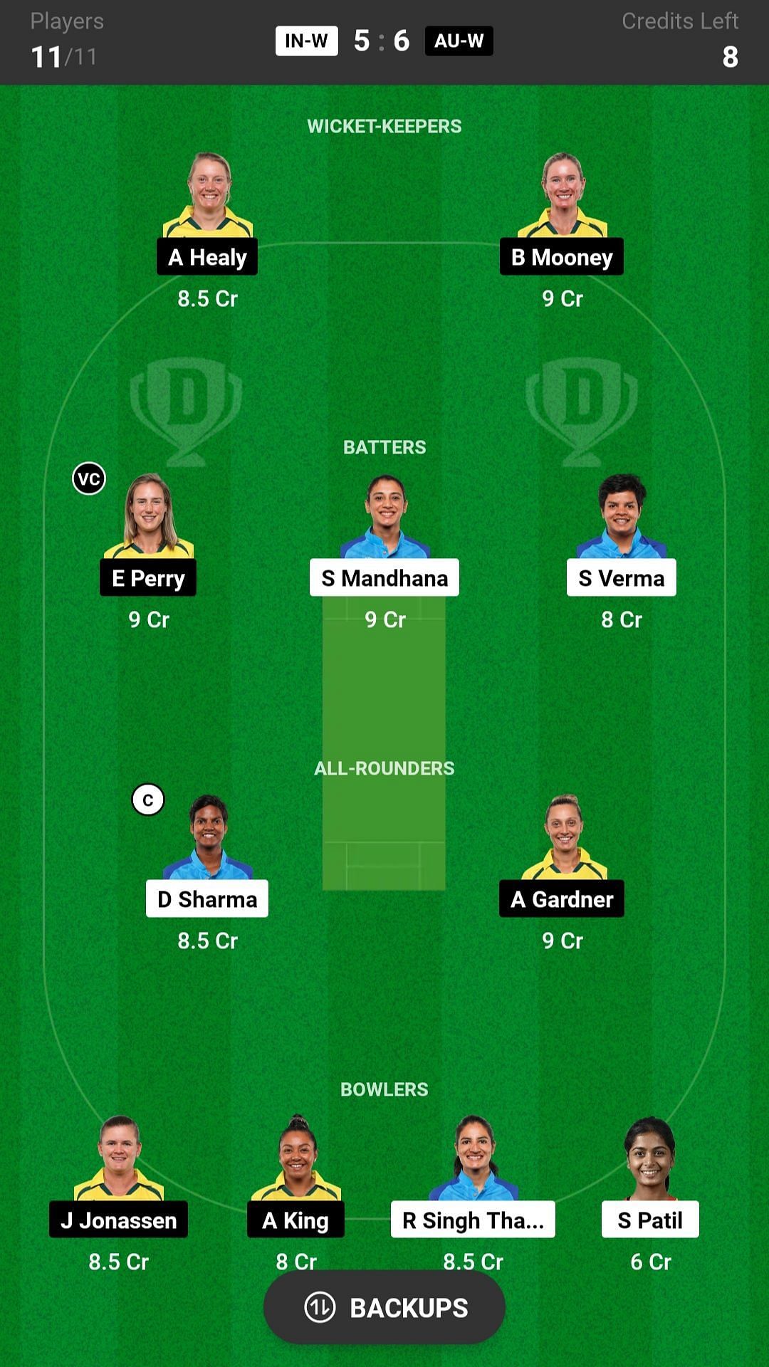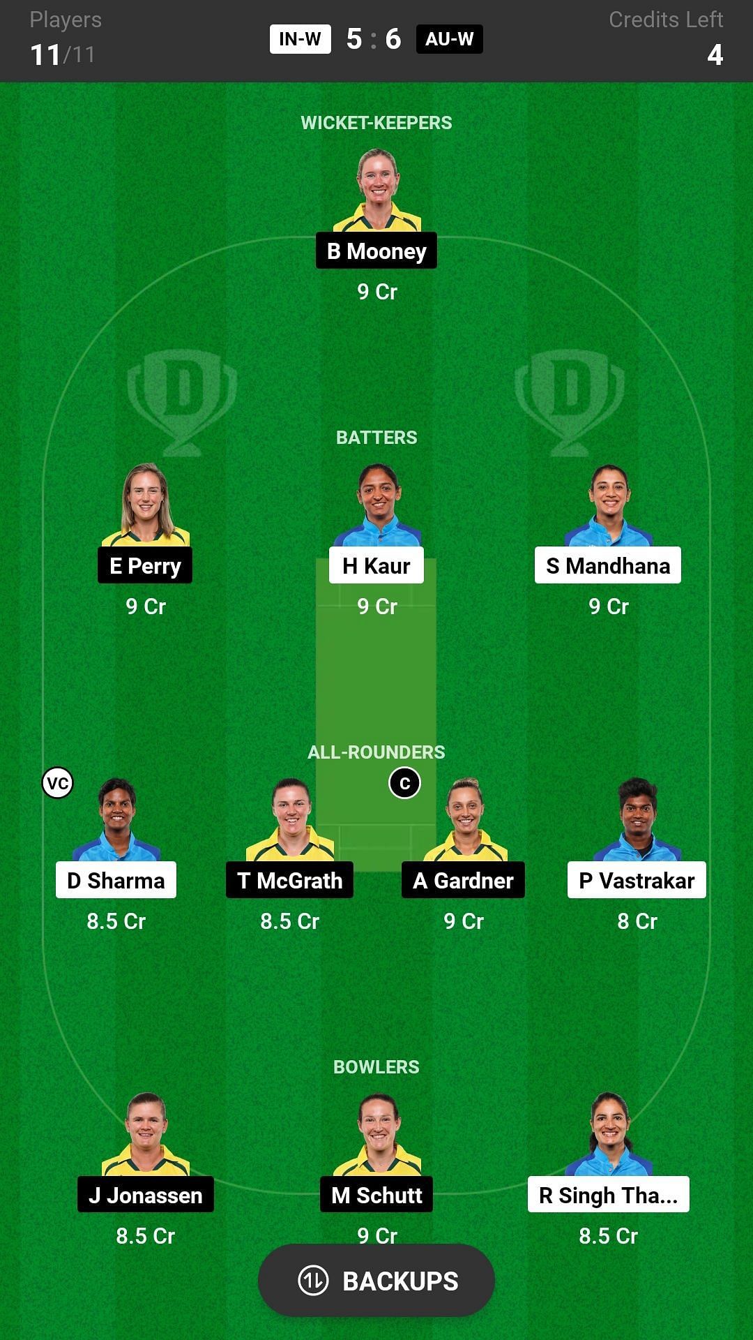 A Gardner and D Sharma are the best all-rounder picks for the Dream11 team as they are batting in the middle order and also completing their quota of overs. T McGrath is another good all-rounder pick for today's match.
