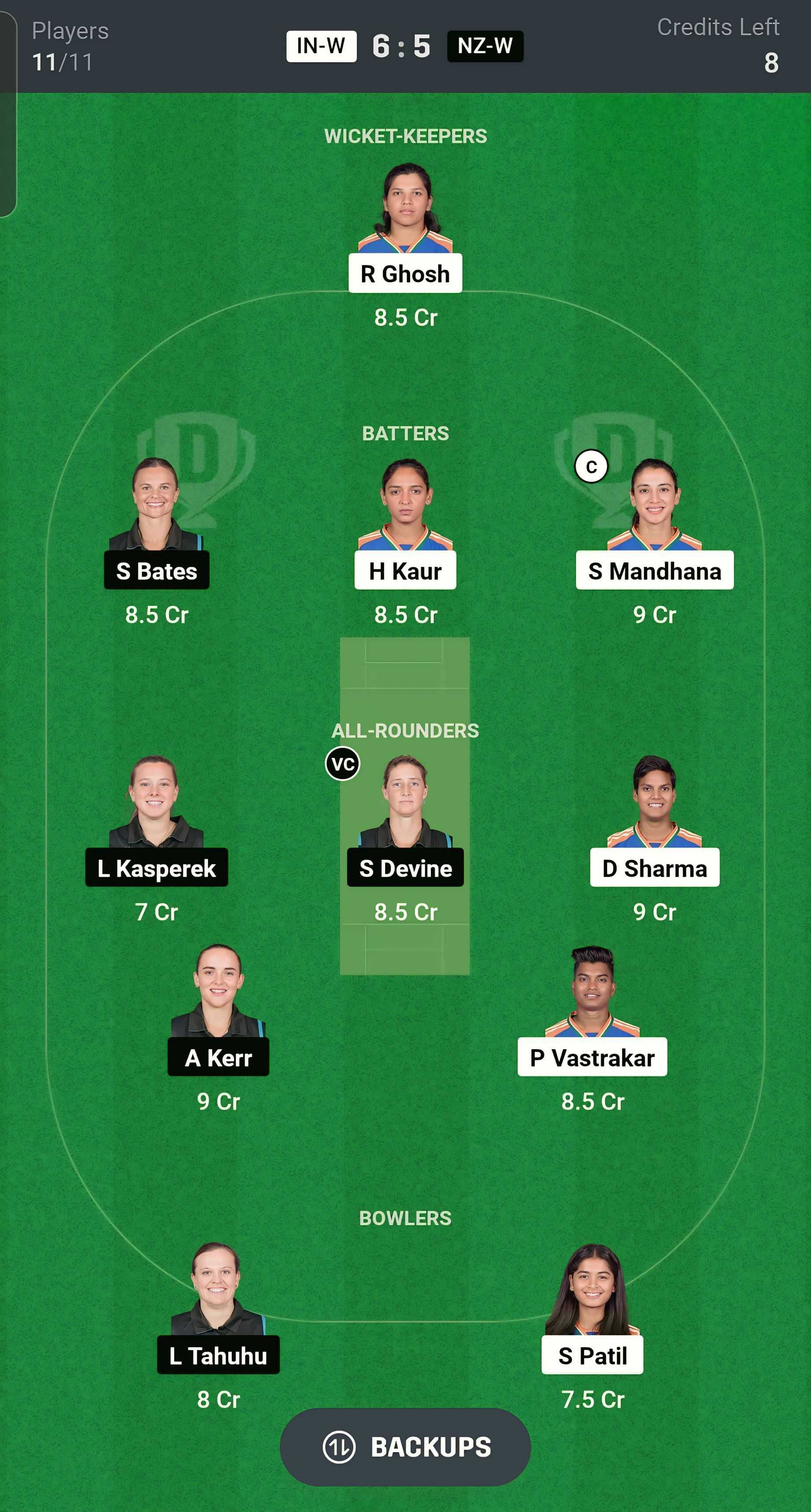 Amelia Kerr and Deepti Sharma are the best all-rounder picks for the Dream11 team. Both will play a crucial role for their teams in today's match. Amelia Kerr is currently one of the best all-rounders in the world. She will bat in the top order and also complete her quota of overs. Pooja Vastrakar is another good all-rounder for today's match. She will bat in the middle order and bowl a good number of overs.