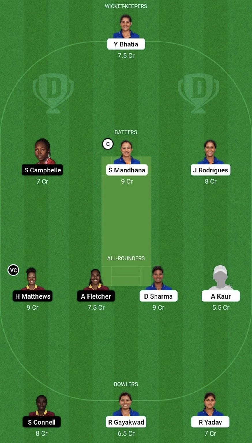 All-rounders: Hayley Matthews (vc), Afy Fletcher, Deepti Sharma (c), Sneh Rana
