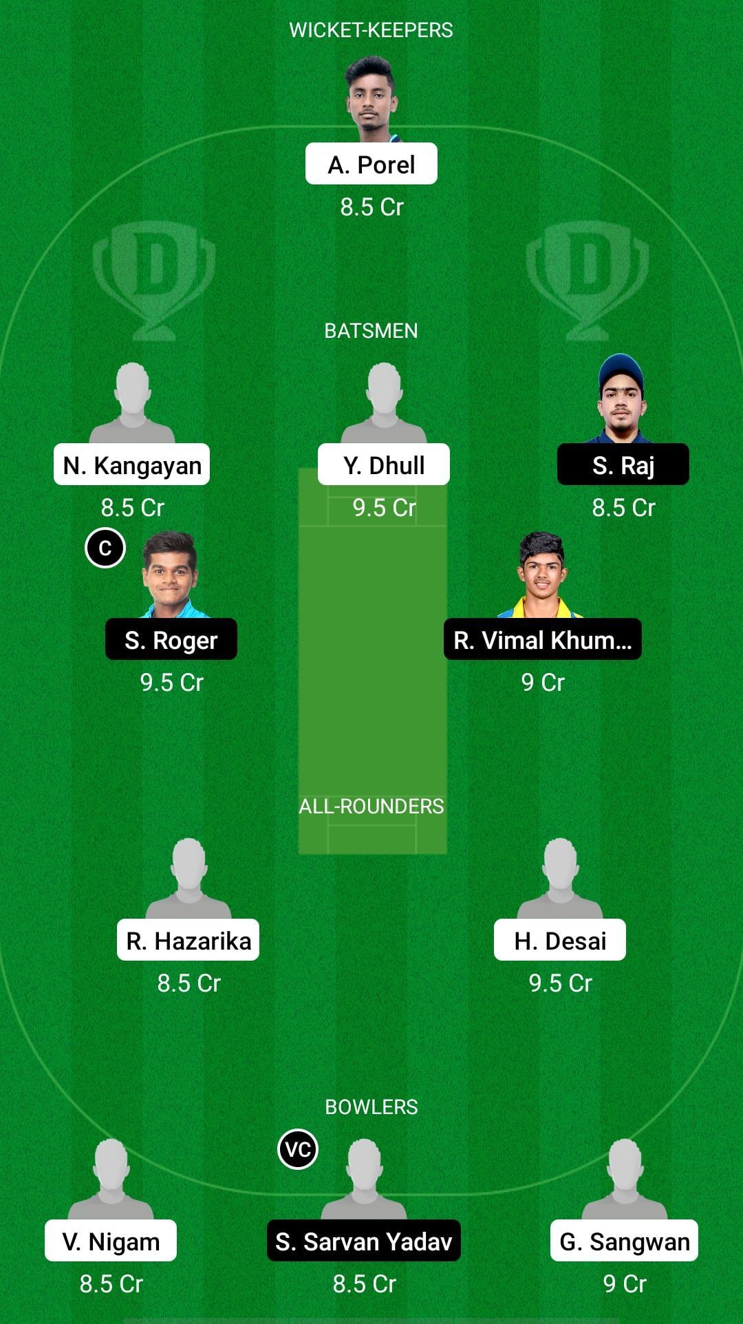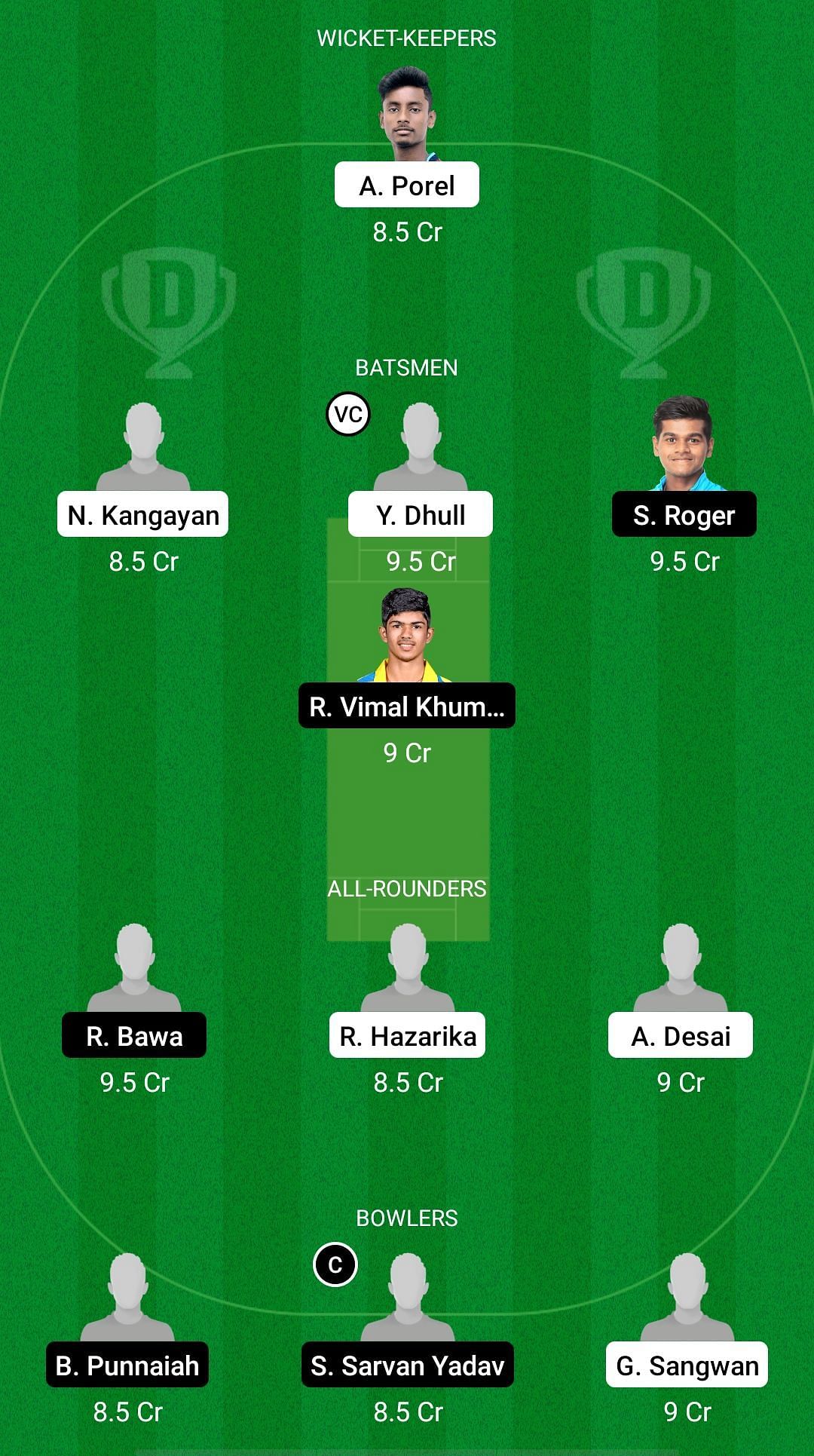 Fantasy Suggestion #1: Abhishek Porel, Neyan Kangayan, Yash Dhull, Sahil Raj, Shoun Roger, R Vimal Khumar, Rohan Hazarika, Harsh Desai, Vipraj Nigam, Siddharth Sarwan Yadav, Garv Sangwan.
