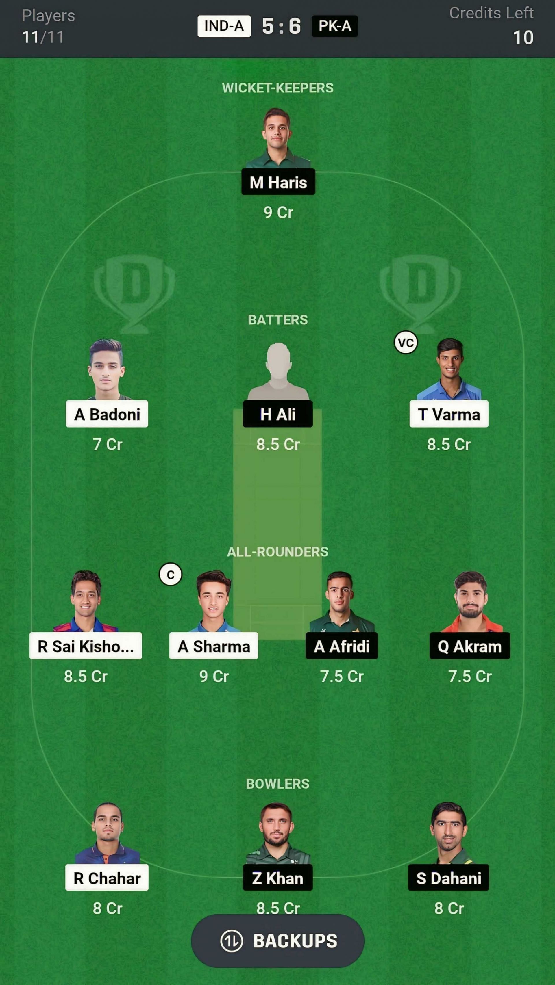 All-rounders: R Sai Kishore, A Sharma, A Afridi, Q Akram