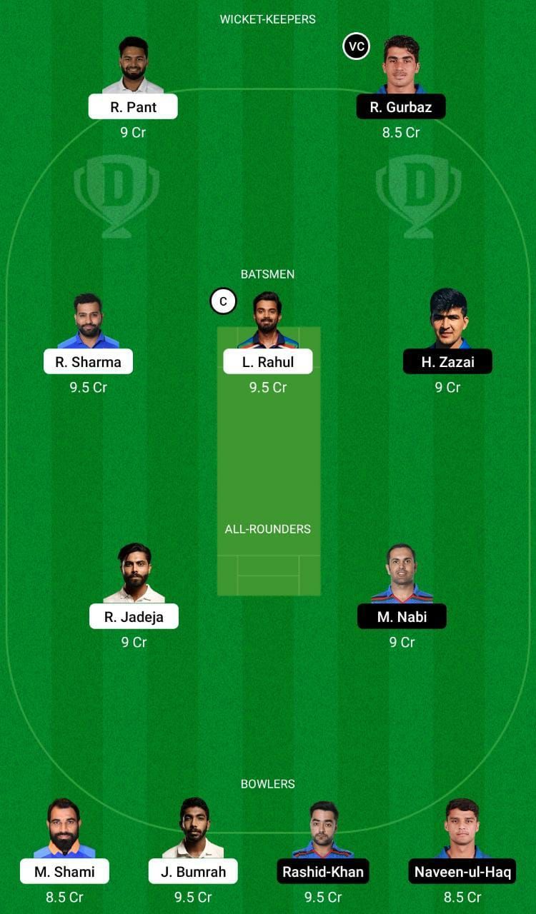 Fantasy Suggestion #2: Rahmanullah Gurbaz, Rishabh Pant, Hazratullah Zazai, KL Rahul, Rohit Sharma, Mohammad Nabi, Ravindra Jadeja, Rashid Khan, Naveen ul Haq, Jasprit Bumrah and Mohammed Shami