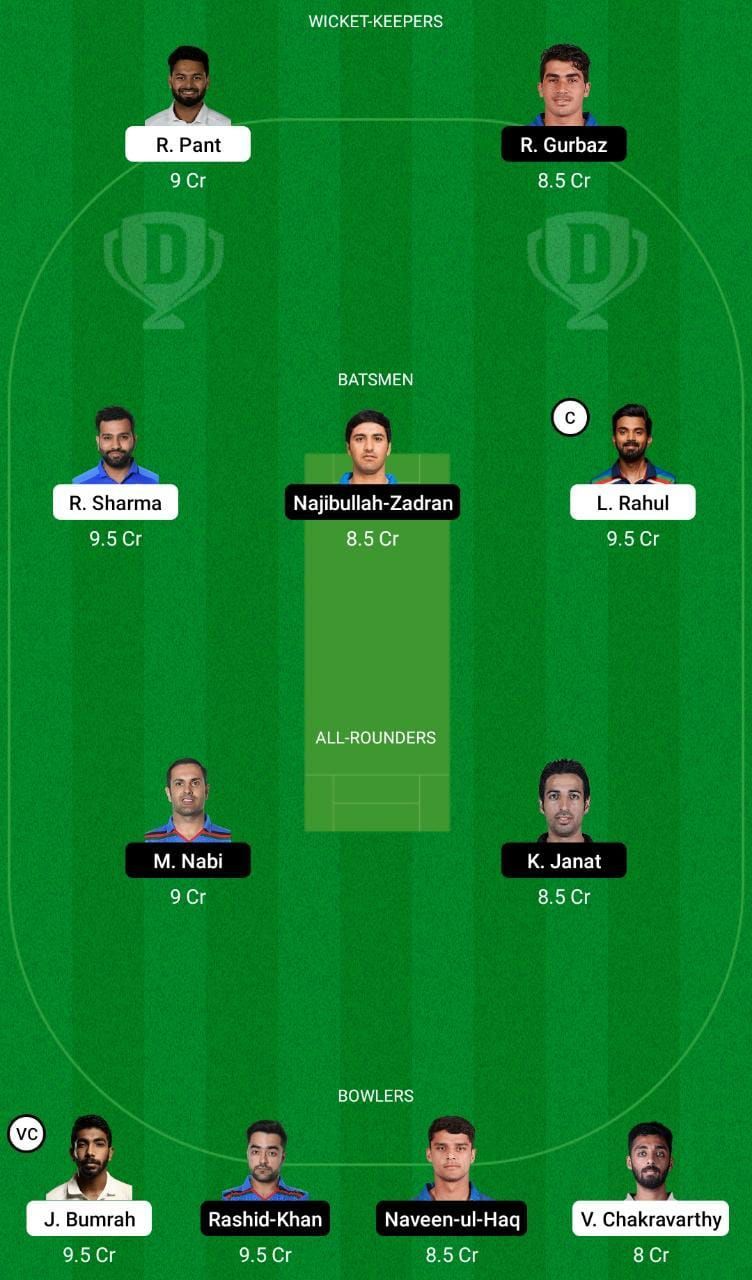 Fantasy Suggestion #1: Rahmanullah Gurbaz, Rishabh Pant, Najibullah Zadran, KL Rahul, Rohit Sharma, Mohammad Nabi, Karim Janat, Rashid Khan, Naveen ul Haq, Jasprit Bumrah and Varun Chakravarthy
