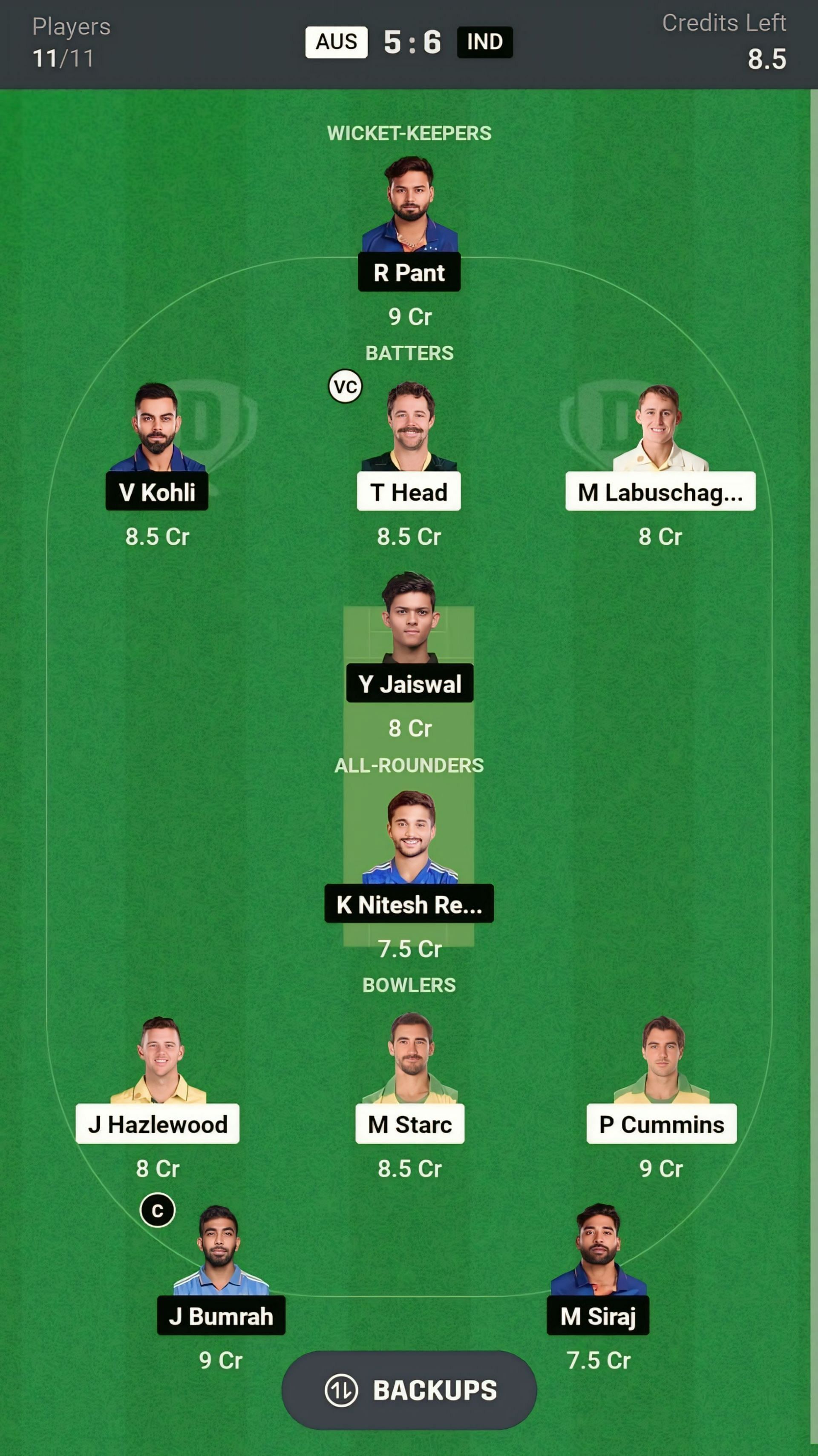 Batters: Y Jaiswal, V Kohli, T Head, M Labuschagne