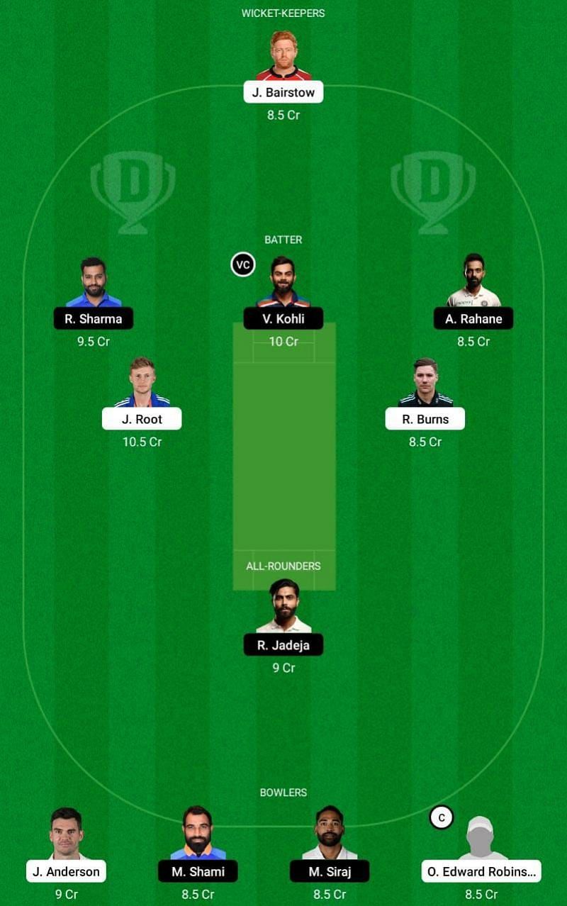 Fantasy Suggestion #2: Jonny Bairstow, Rohit Sharma, Virat Kohli, Joe Root, Rory Burns, Ravindra Jadeja, Ajinkya Rahane, James Anderson, Mohammed Shami, Mohammed Siraj and Ollie Robinson