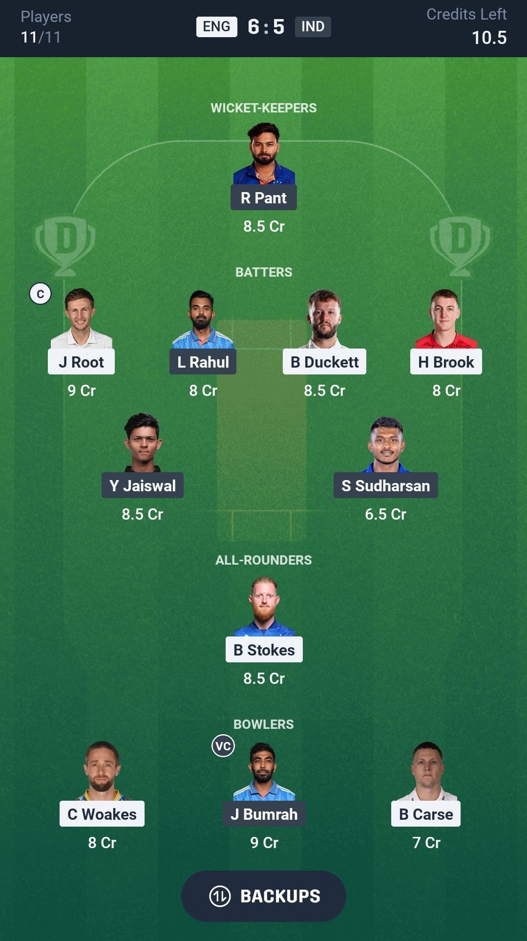 Batters: J Root, S Sudharsan, B Duckett, H Brook, Y Jaiswal, KL Rahul