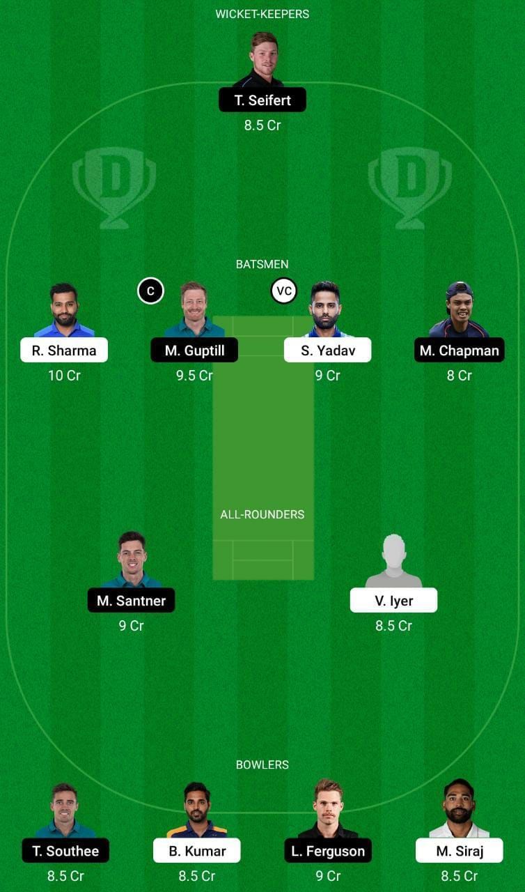 Fantasy Suggestion #2: Tim Seifert, Rohit Sharma, Martin Guptill, Suryakumar Yadav, Mark Chapman, Venkatesh Iyer, Mitchell Santner, Bhuvneshwar Kumar, Mohammed Siraj, Tim Southee and Lockie Ferguson