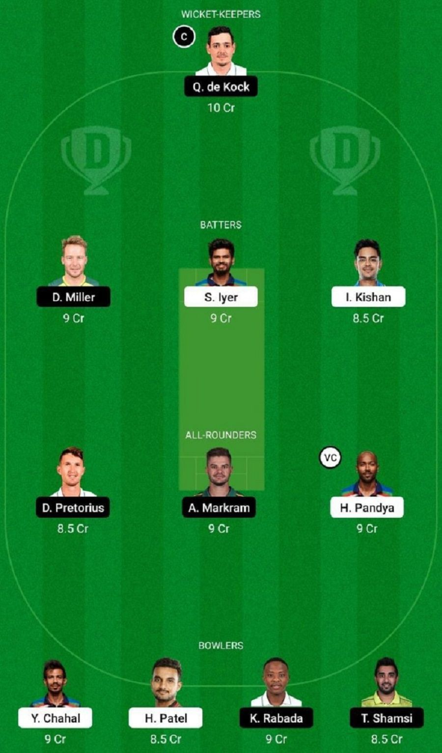 Fantasy Suggestion #2: Quinton de Kock, Shreyas Iyer, Ishan Kishan, Dwaine Pretorius, David Miller, Hardik Pandya, Aiden Markram, Yuzvendra Chahal, Harshal Patel, Kagiso Rabada and Tabraiz Shamsi.