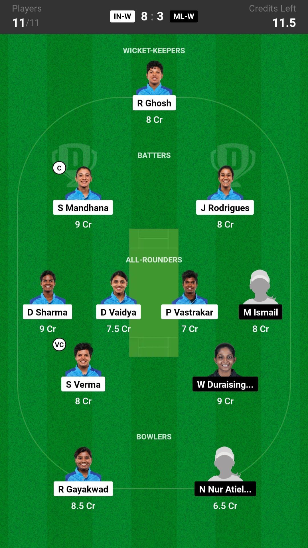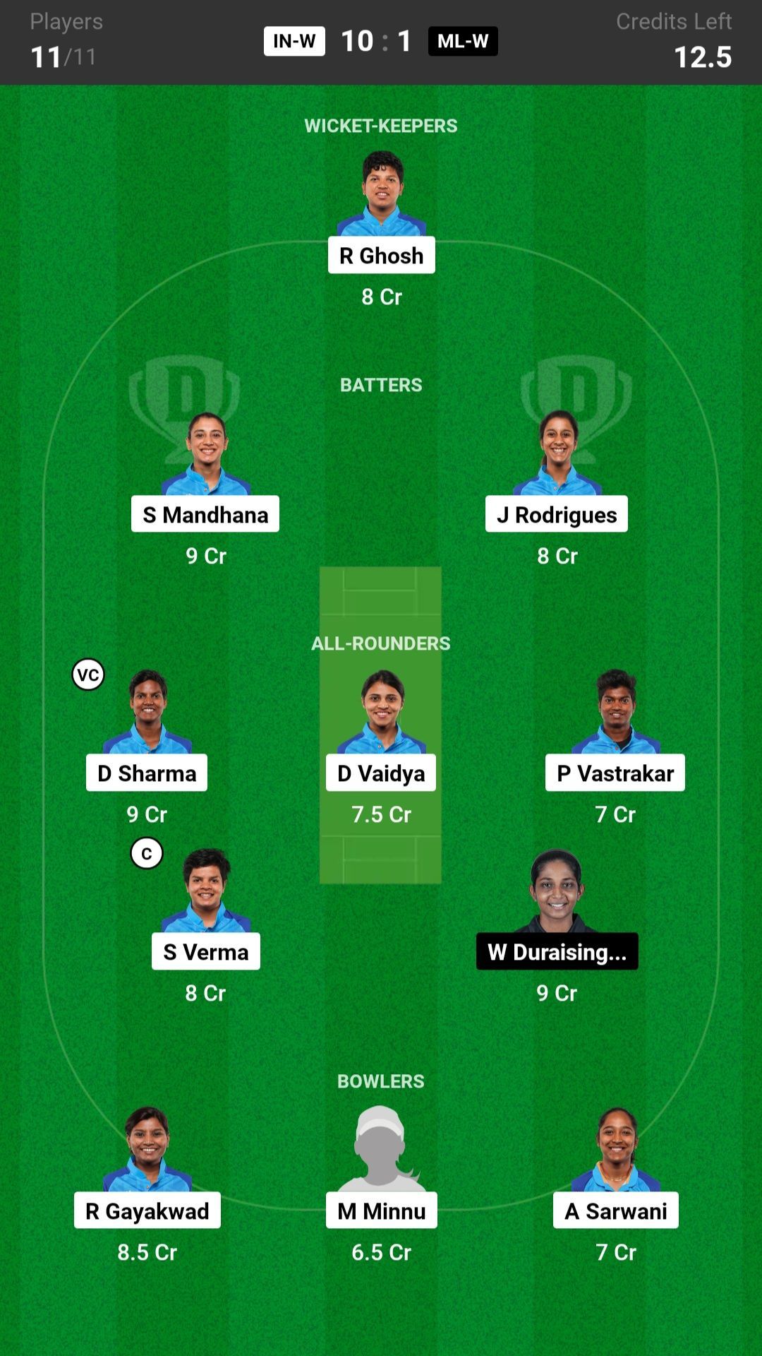 IND-W vs ML-W match captain and vice captain choices