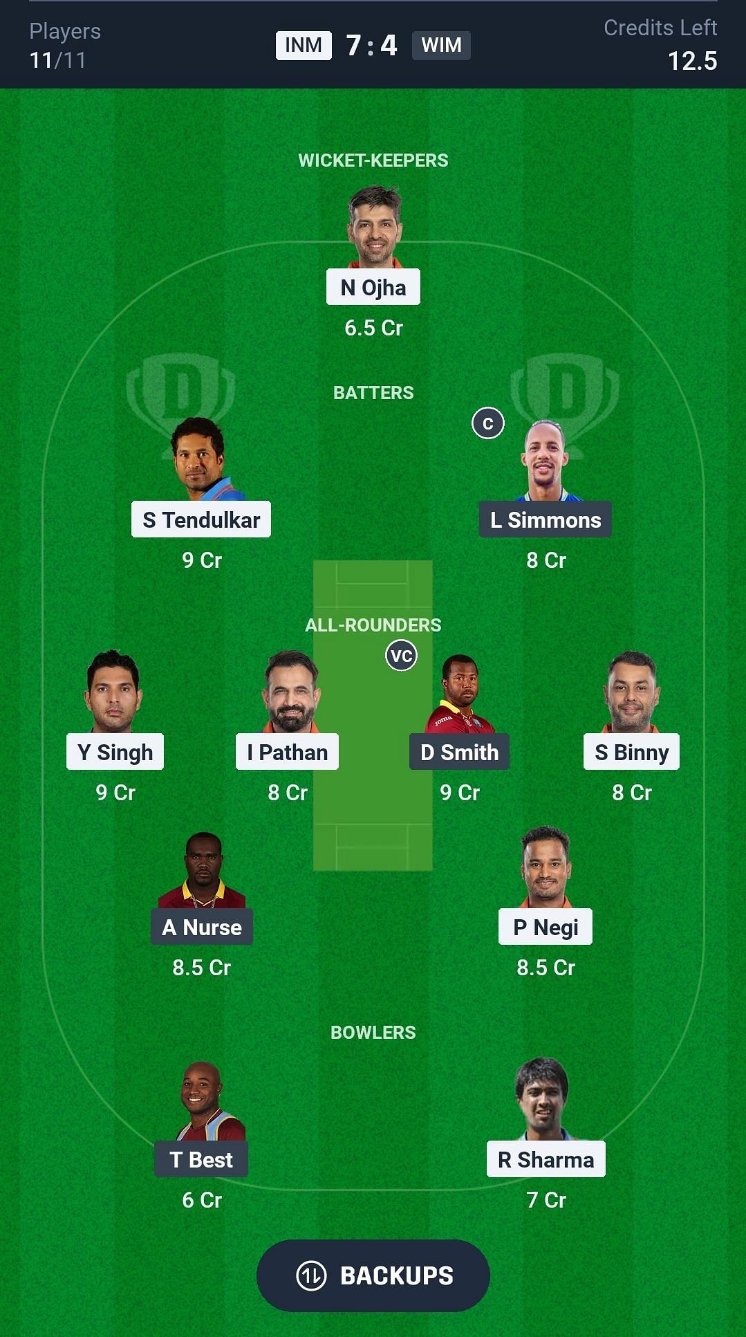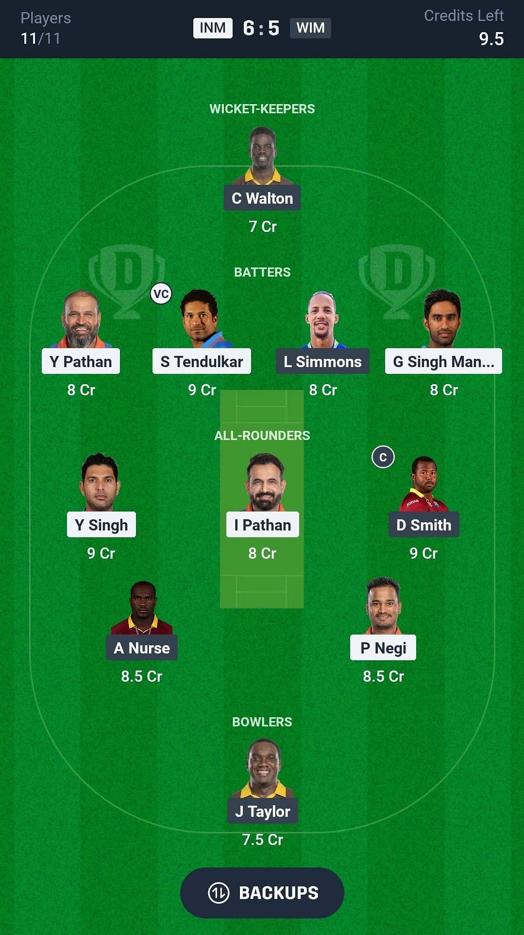 India Masters vs West Indies Masters Dream11 Prediction Today, Grand League