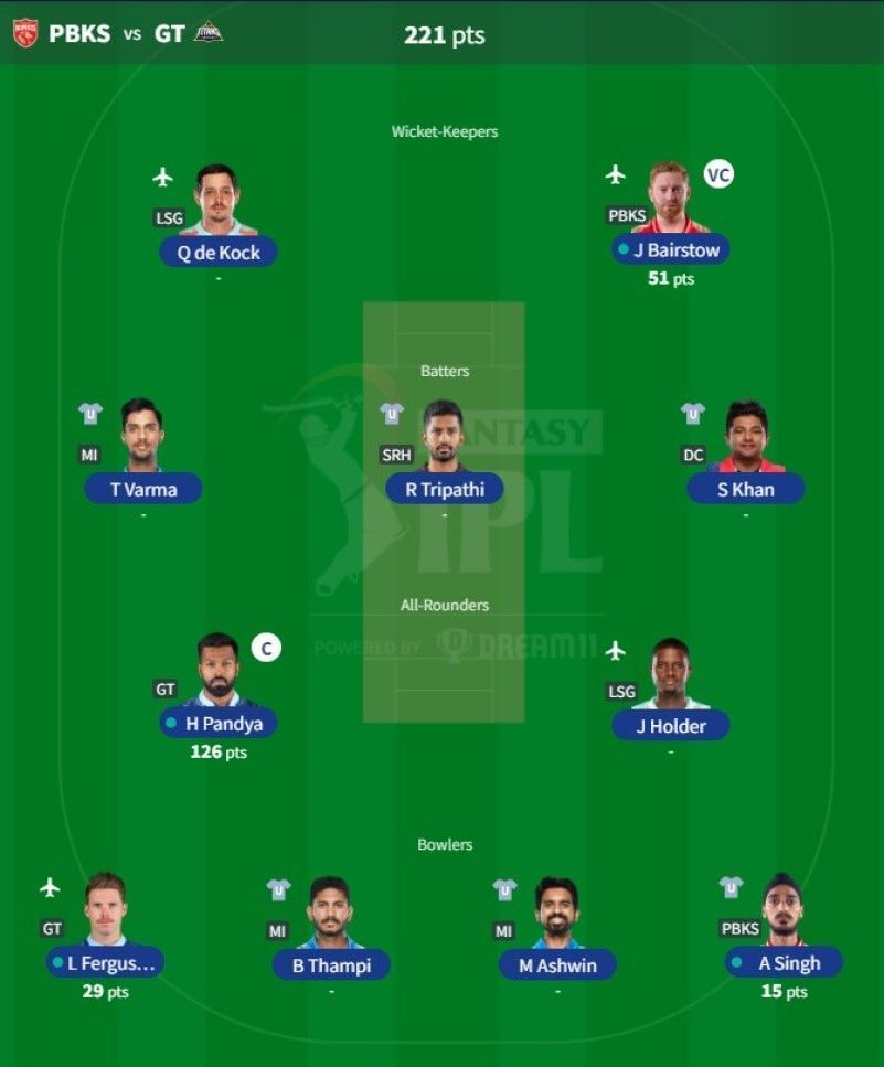 My change in transfer strategy to get Jonny Bairstow (WK) (PBKS) (9.5 Credits) and Lockie Ferguson (BOWL) (GT) (8.5 Credits) didn't pay off.