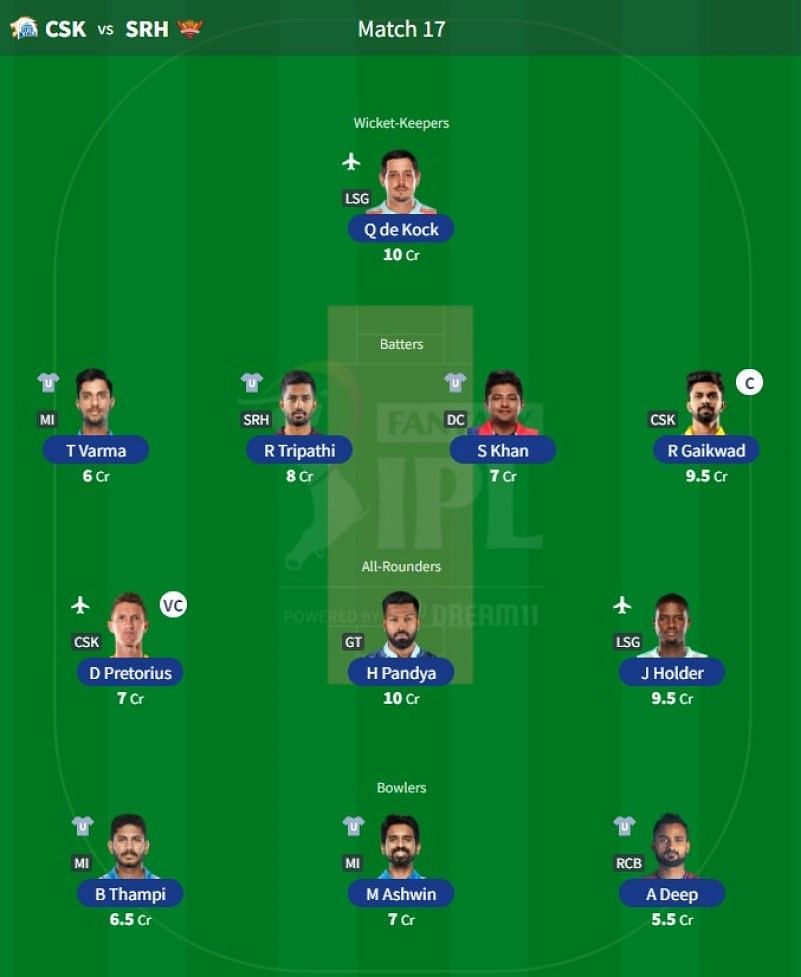 IPL 2022 Fantasy Team for Match 17 - CSK vs SRH