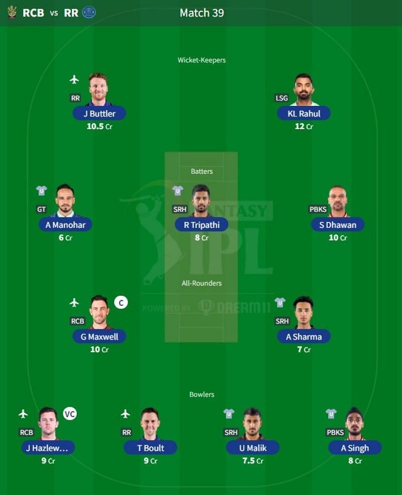 IPL 2022 Fantasy Team for Match 39 - RCB vs RR
