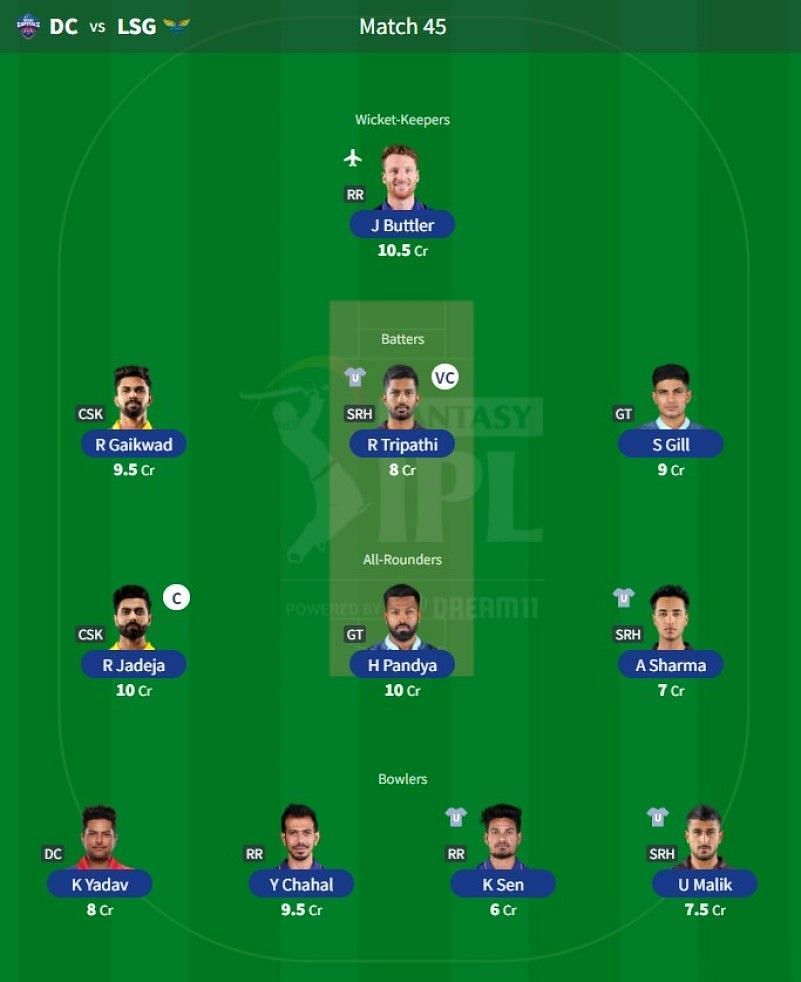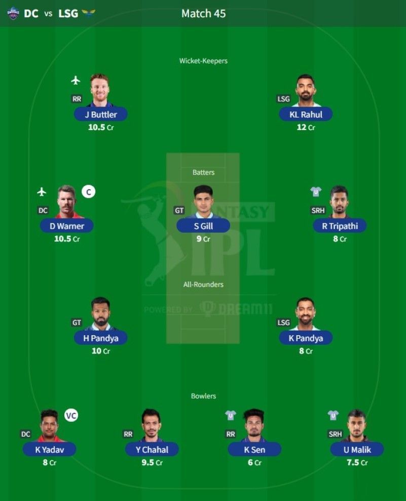 Players playing in Match 45: KL Rahul (WK) (LSG) (12 Credits), David Warner (BAT) (DC) (10.5 Credits), Krunal Pandya (ALL) (LSG) (8 Credits), and Kuldeep Yadav (BOWL) (DC) (8 Credits).