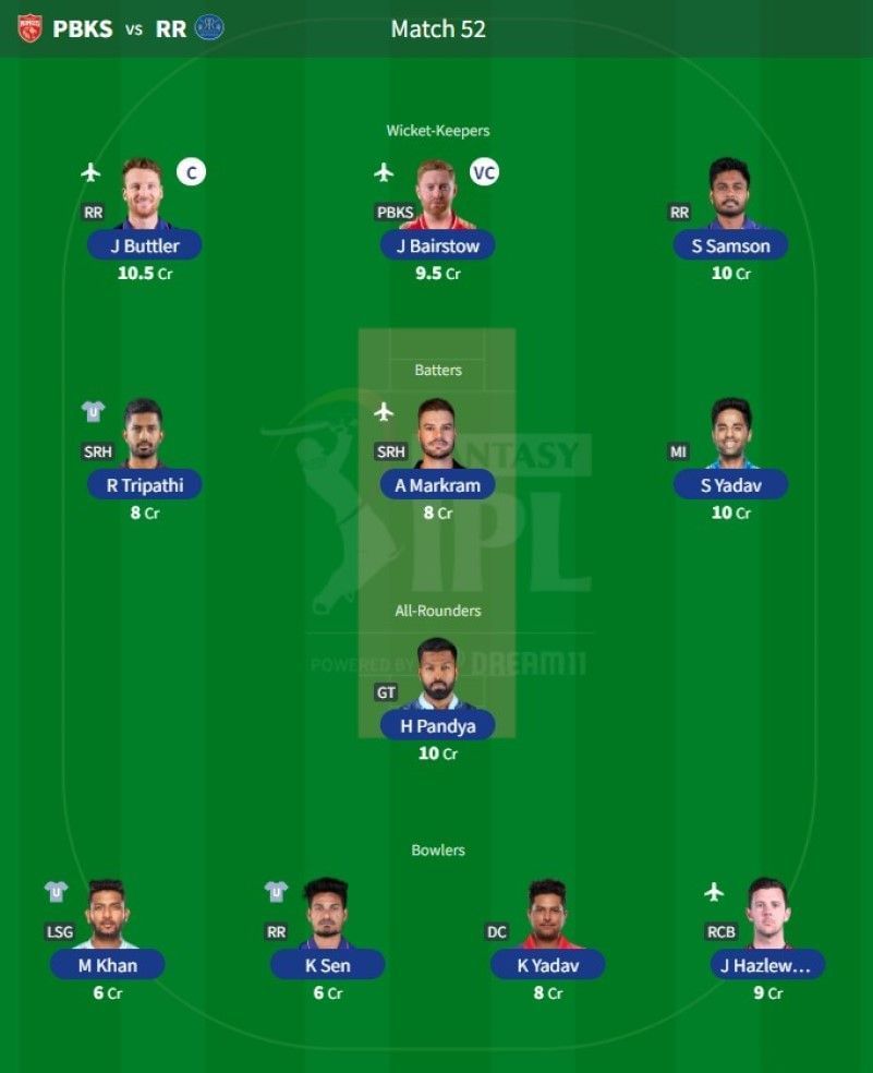 Players playing in Match 52: Jos Buttler (WK) (RR) (10.5 Credits), Kuldeep Sen (BOWL) (RR) (6 Credits), Sanju Samson (WK) (RR) (10 Credits), and Jonny Bairstow (WK) (PBKS) (9.5 Credits)