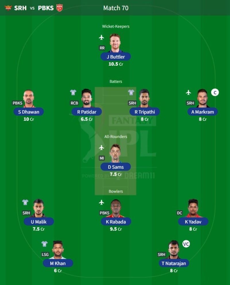 Players playing in Match 70: Shikhar Dhawan (BAT) (PBKS) (10 Credits), Kagiso Rabada (BOWL) (PBKS) (9.5 Credits), Rahul Tripathi (BAT) (SRH) (8 Credits), Umran Malik (BOWL) (SRH) (7.5 Credits), T Natarajan (BOWL) (SRH) (8 Credits), and Aiden Markram (BAT) (SRH) (8 Credits).