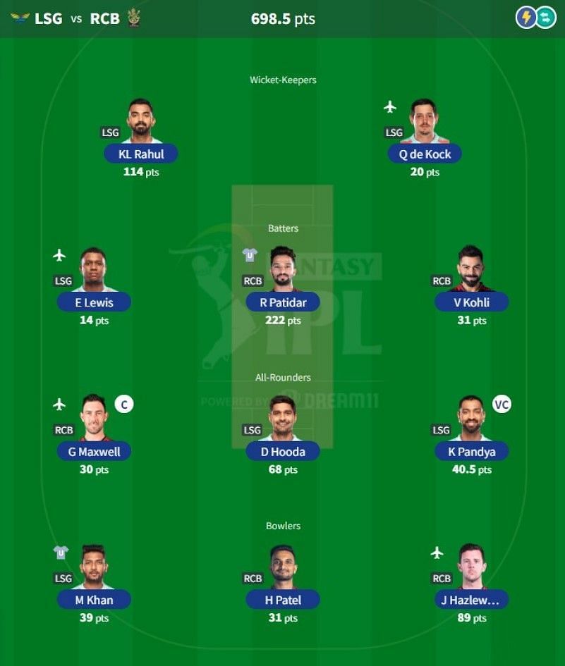 Players playing in Match 72: KL Rahul (WK) (LSG) (12 Credits), Quinton de Kock (WK) (LSG) (10 Credits), Rajat Patidar (BAT) (RCB) (6.5 Credits), Virat Kohli (BAT) (RCB) (12 Credits), Evin Lewis (BAT) (LSG) (8 Credits), Glenn Maxwell (ALL) (RCB) (10 Credits), Deepak Hooda (ALL) (LSG) (8 Credits), Krunal Pandya (ALL) (LSG) (8 Credits), Mohsin Khan (BOWL) (LSG) (6 Credits), Josh Hazlewood (BOWL) (RCB) (9 Credits), and Harshal Patel (BOWL) (RCB) (9 Credits)