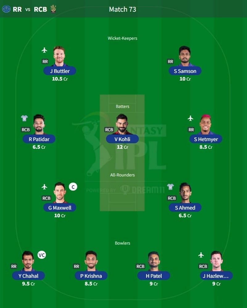 IPL 2022 Fantasy Team for Match 73 - RR vs RCB