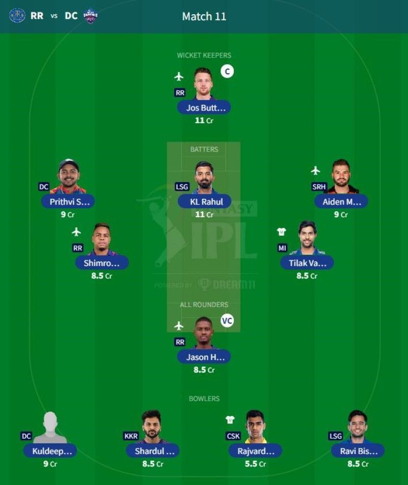 Players playing in Match 11: Kuldeep Yadav (BOWL) (DC) (9 Credits), Prithvi Shaw (DC) (BAT) (9 Credits), Jason Holder (ALL) (RR) (8.5 Credits), Shimron Hetmyer (BAT) (RR) (8.5 Credits), and Jos Buttler (WK) (RR) (11 Credits).