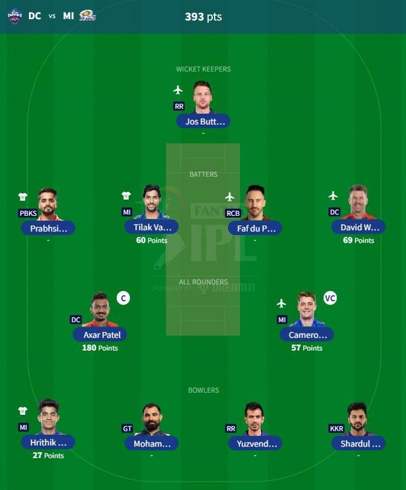Players playing in Match 16: Axar Patel (ALL) (DC) (9 Credits), Cameron Green (ALL) (MI) (9 Credits), Tilak Varma (BAT) (MI) (8.5 Credits), David Warner (BAT) (DC) (10 Credits), and Hrithik Shokeen (BOWL) (MI) (6.5 Credits).